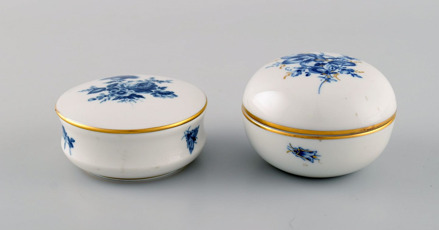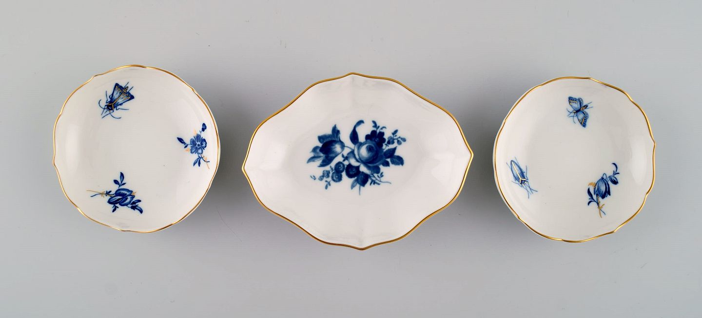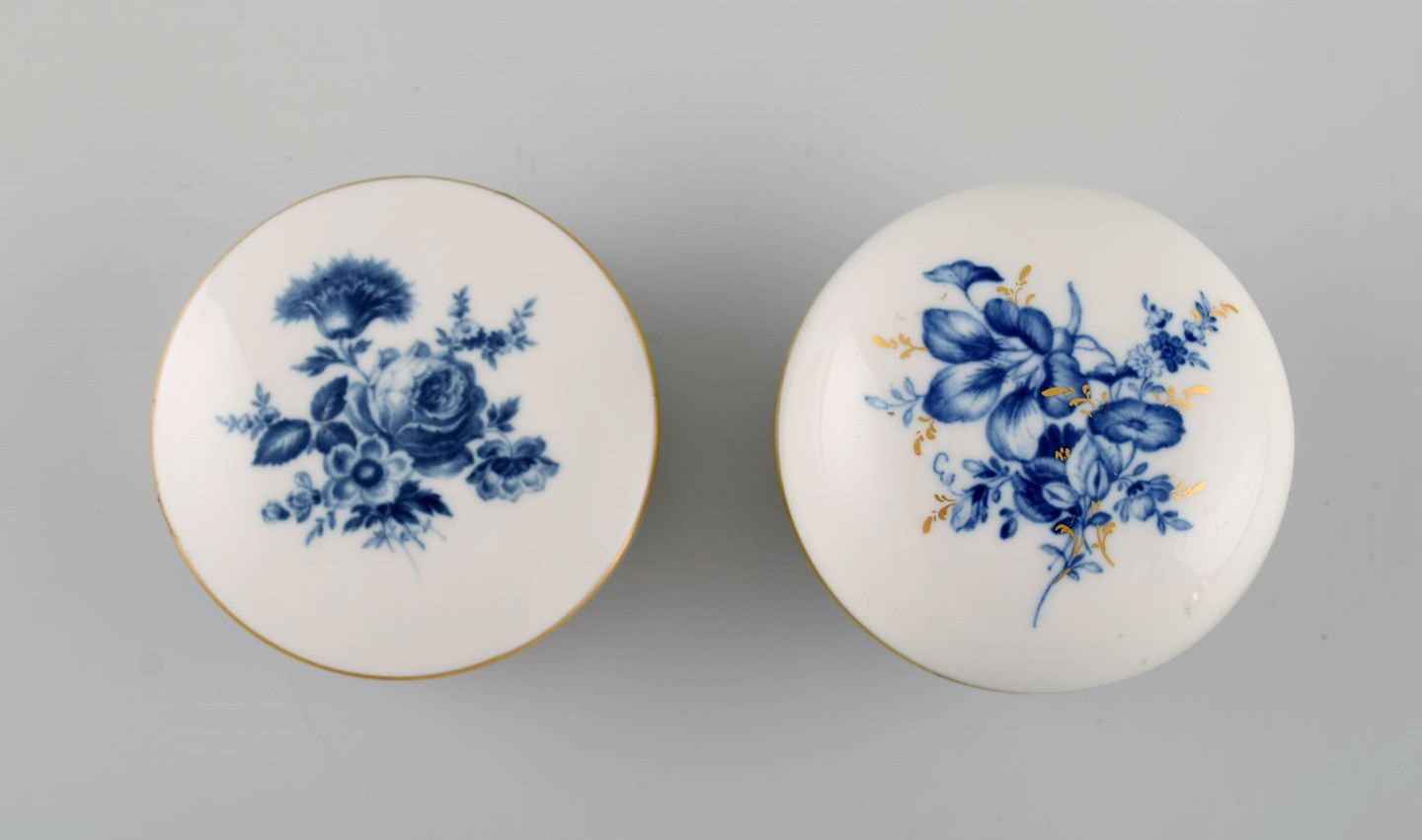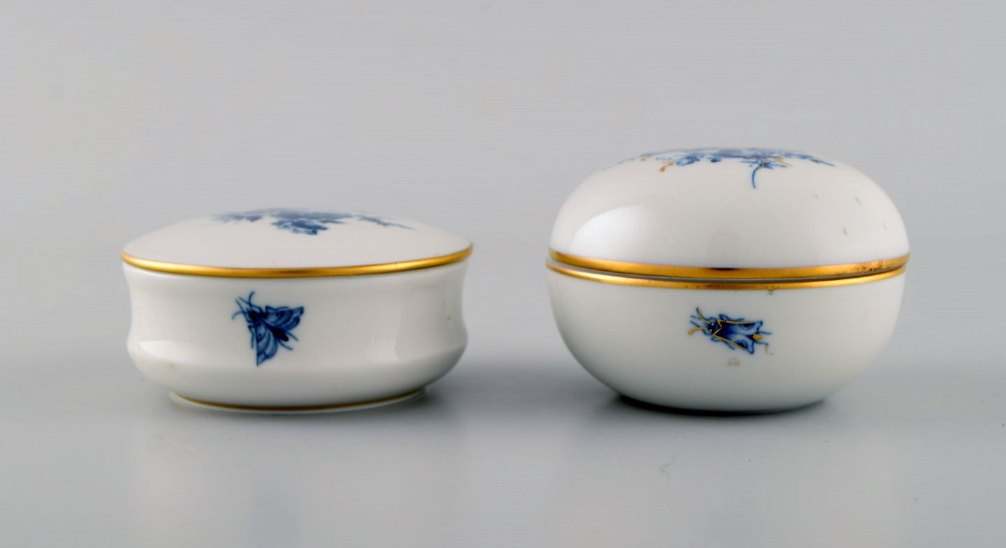 Meissen Aquatinta. To lågdåser og tre kaviarskåle i porcelæn med håndmalede blå blomster og guldkant. 1900-tallet.