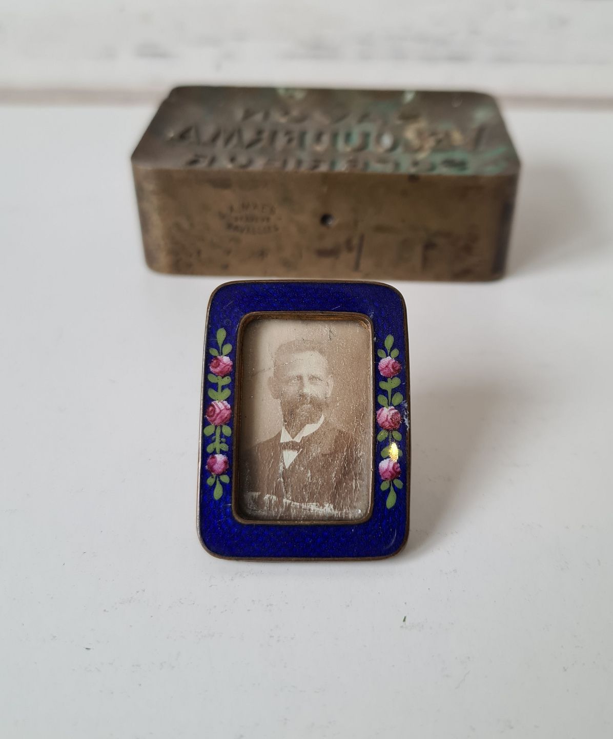 Smuk gammel miniature ramme med blå emalje dekoreret med roser.