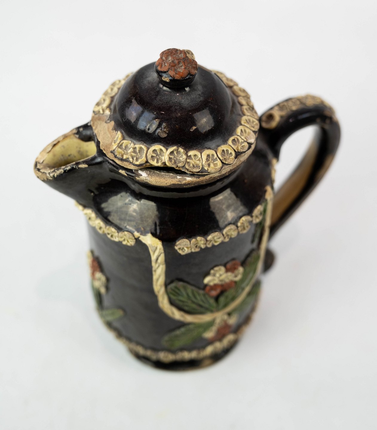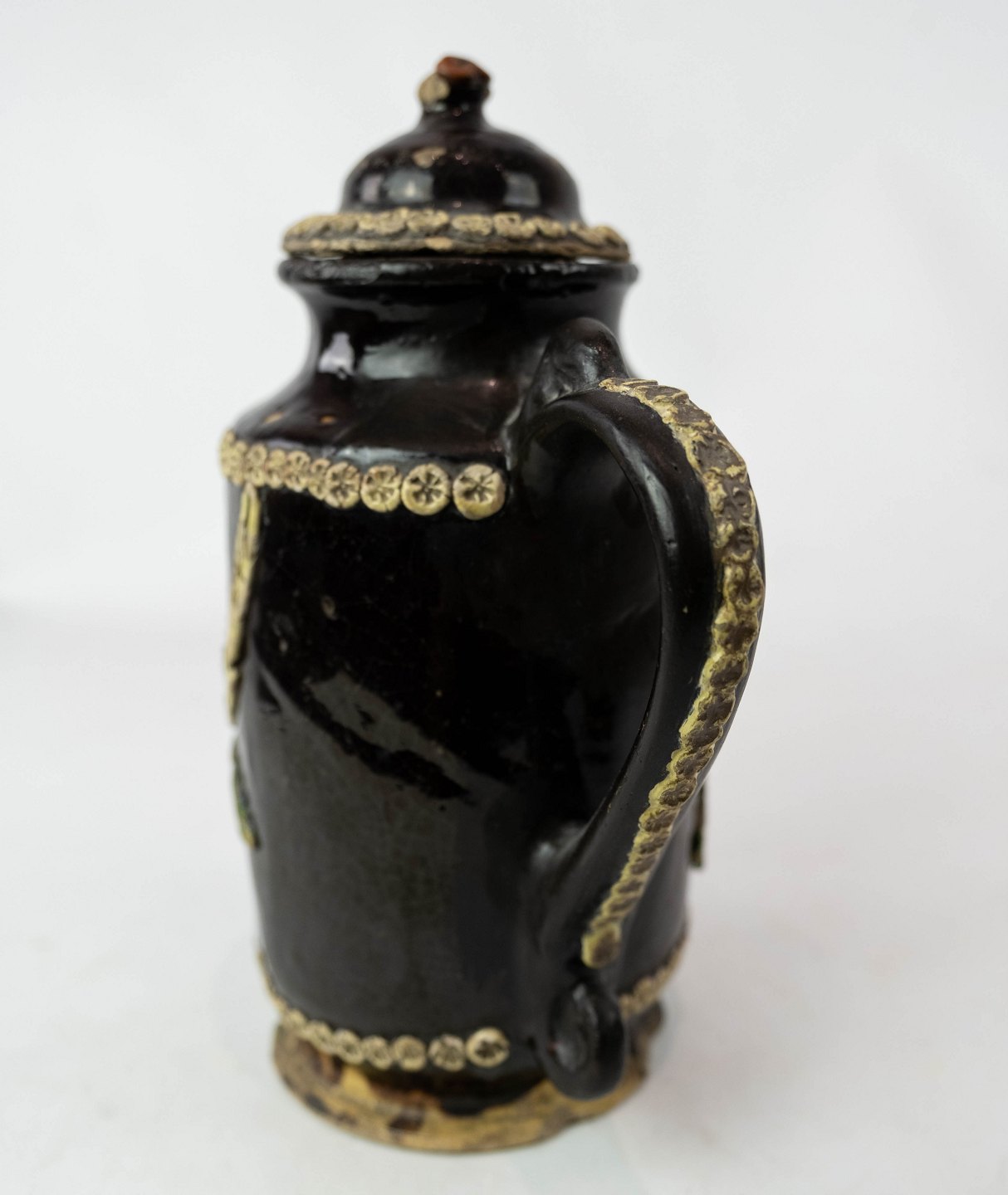 Sæt af to tyske sorte ler kander dekoreret med guld og blomster fra 1860.