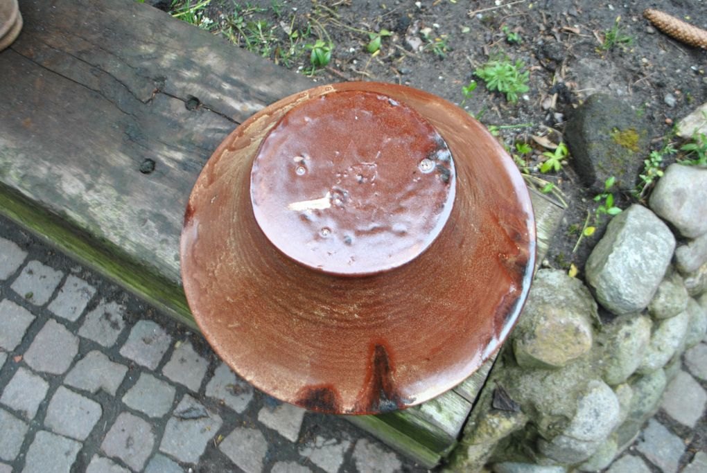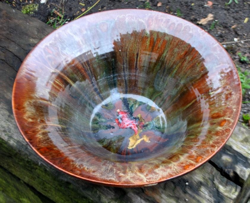 Moth design (20. årh.) Danmark: Stor bordskål. Ler. løbende glasurer i grønt, brunt og rødt. Signeret: Moth Design. H.: 12,5 cm. Dia.: 34 cm.
