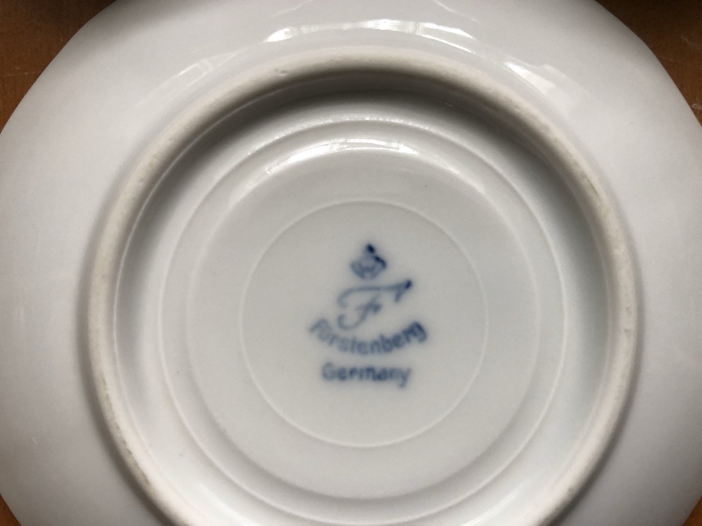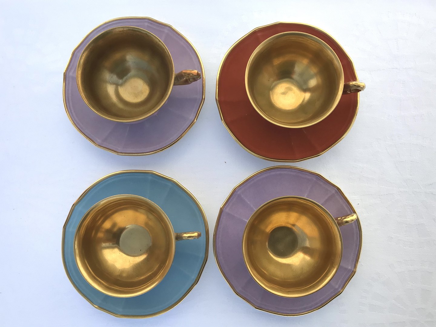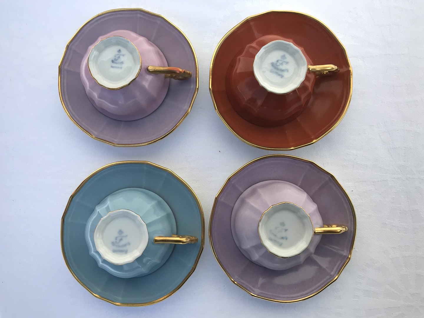 Colored mocha cups with gold, 6.7cm in diameter, 4cm high, Blue, Light purple, Brown, Dark purple * Nice slightly worn condition * Stamped F, Fürstenberg, Germany.
