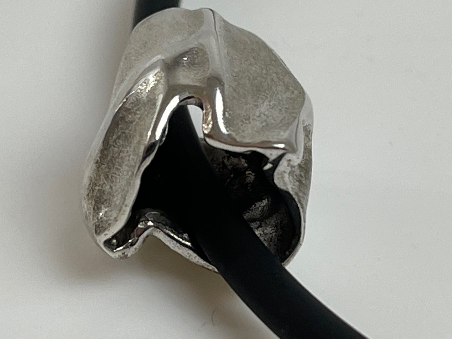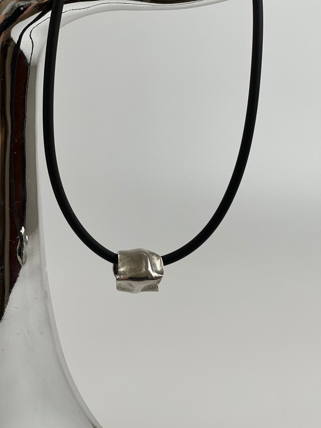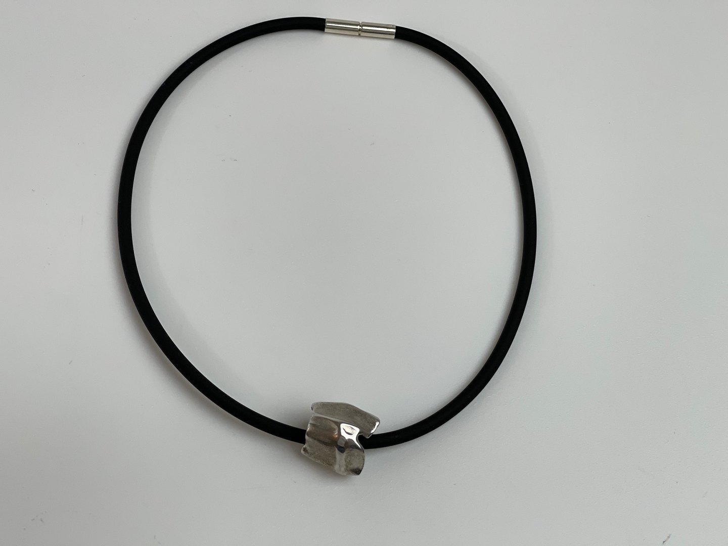 Sølv vedhæng "Tumling" fra Toftegaard med "kæde" af naturgummi, der lukkes med lås af sølv. Smykket er ubrugt.