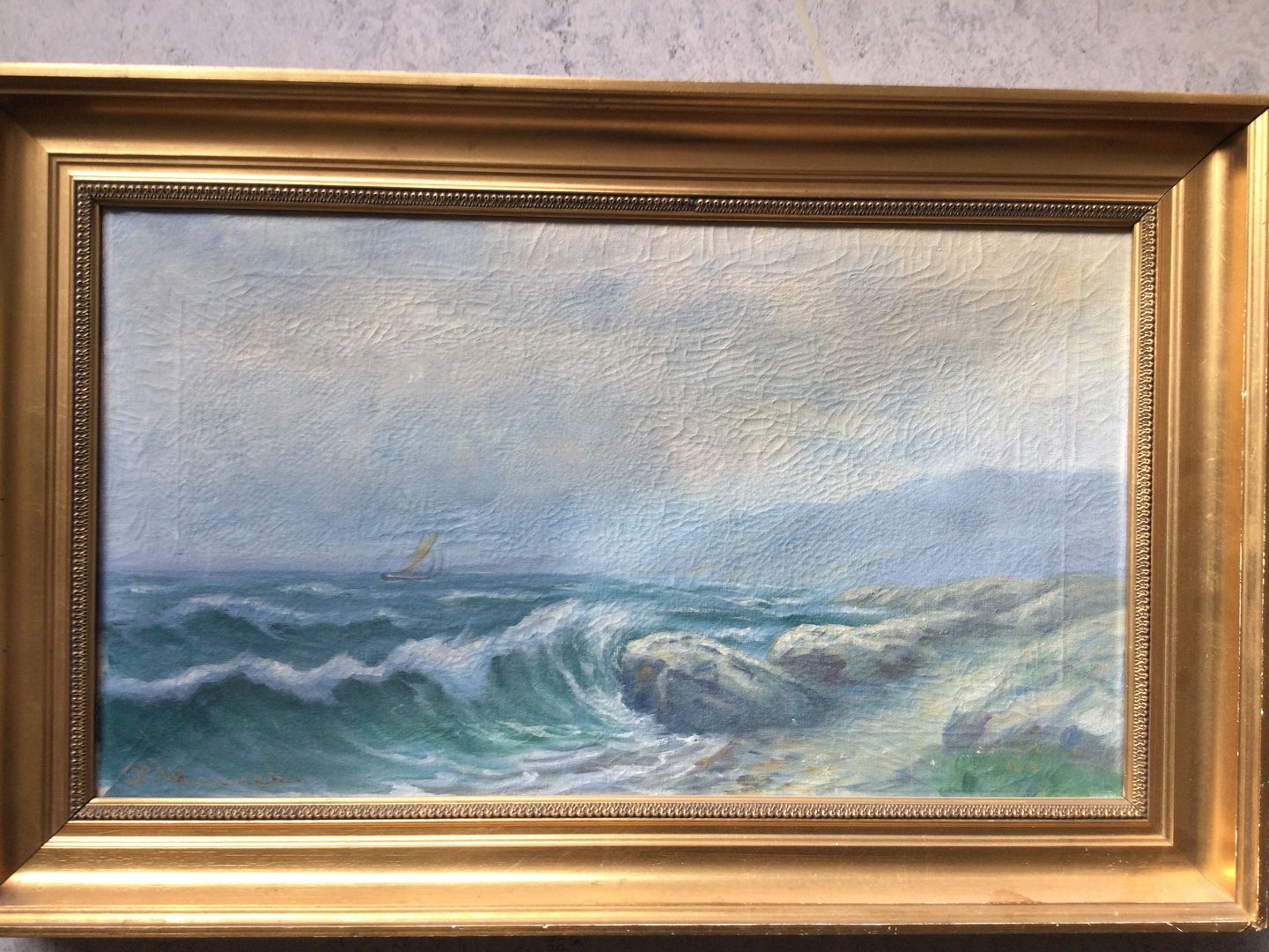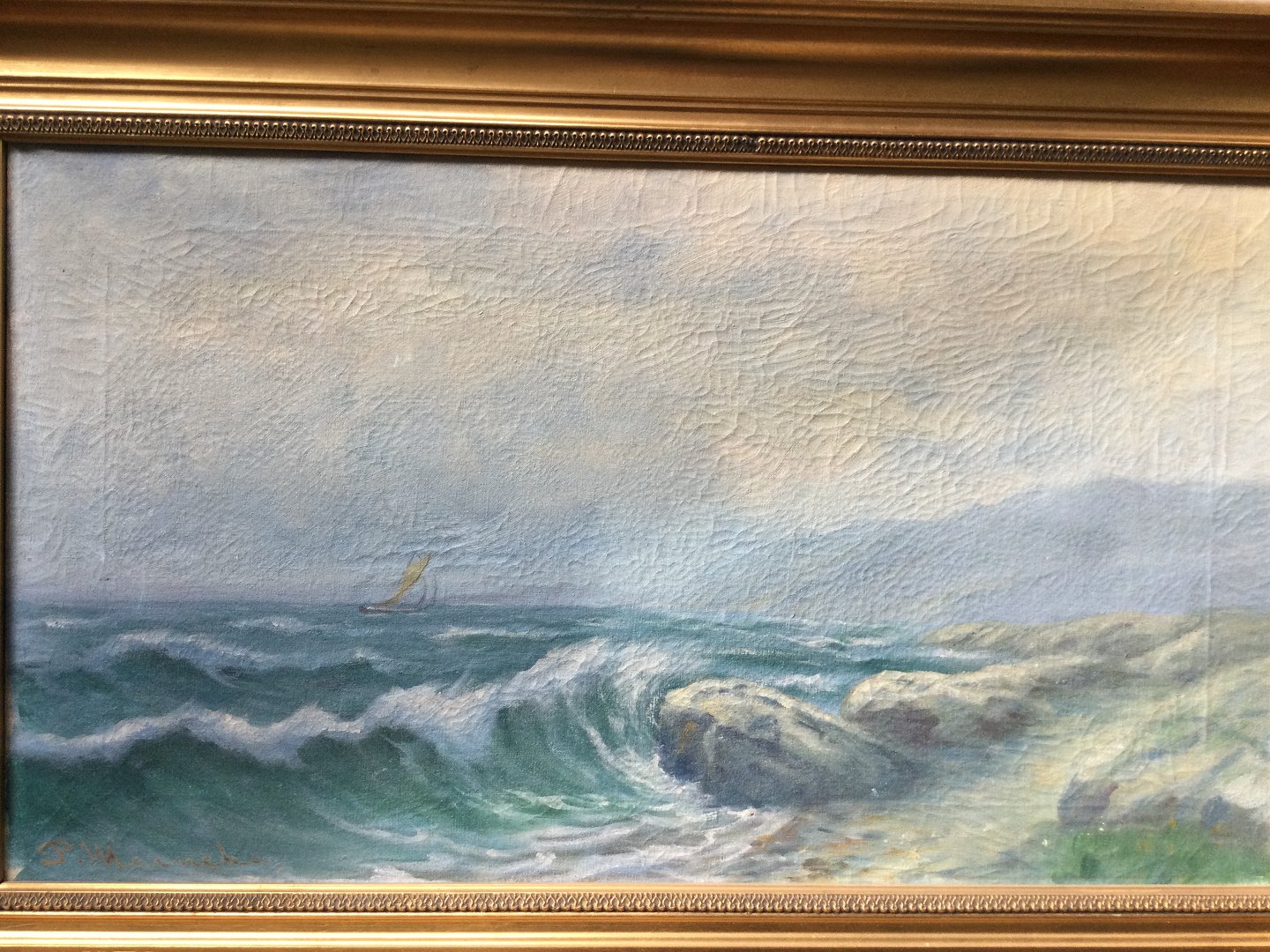 Maleri af P. Meineke - kystparti med skib.