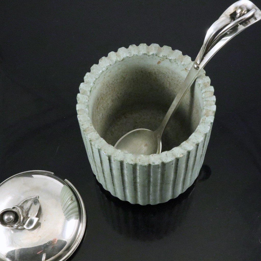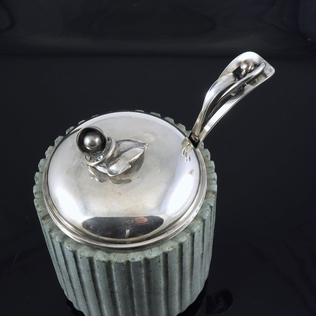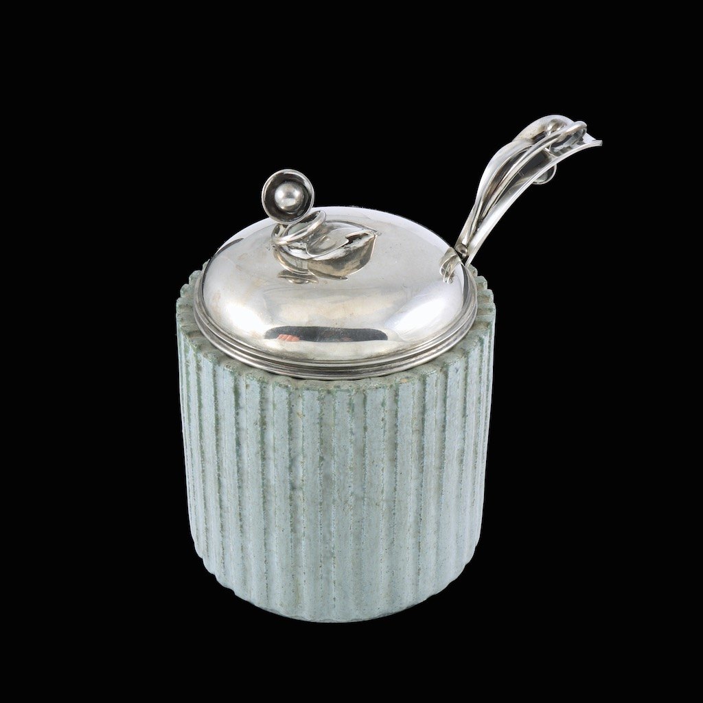 Arne Bang - Carl M. Cohr. Krukke i stentøj med låg samt ske i sølv.