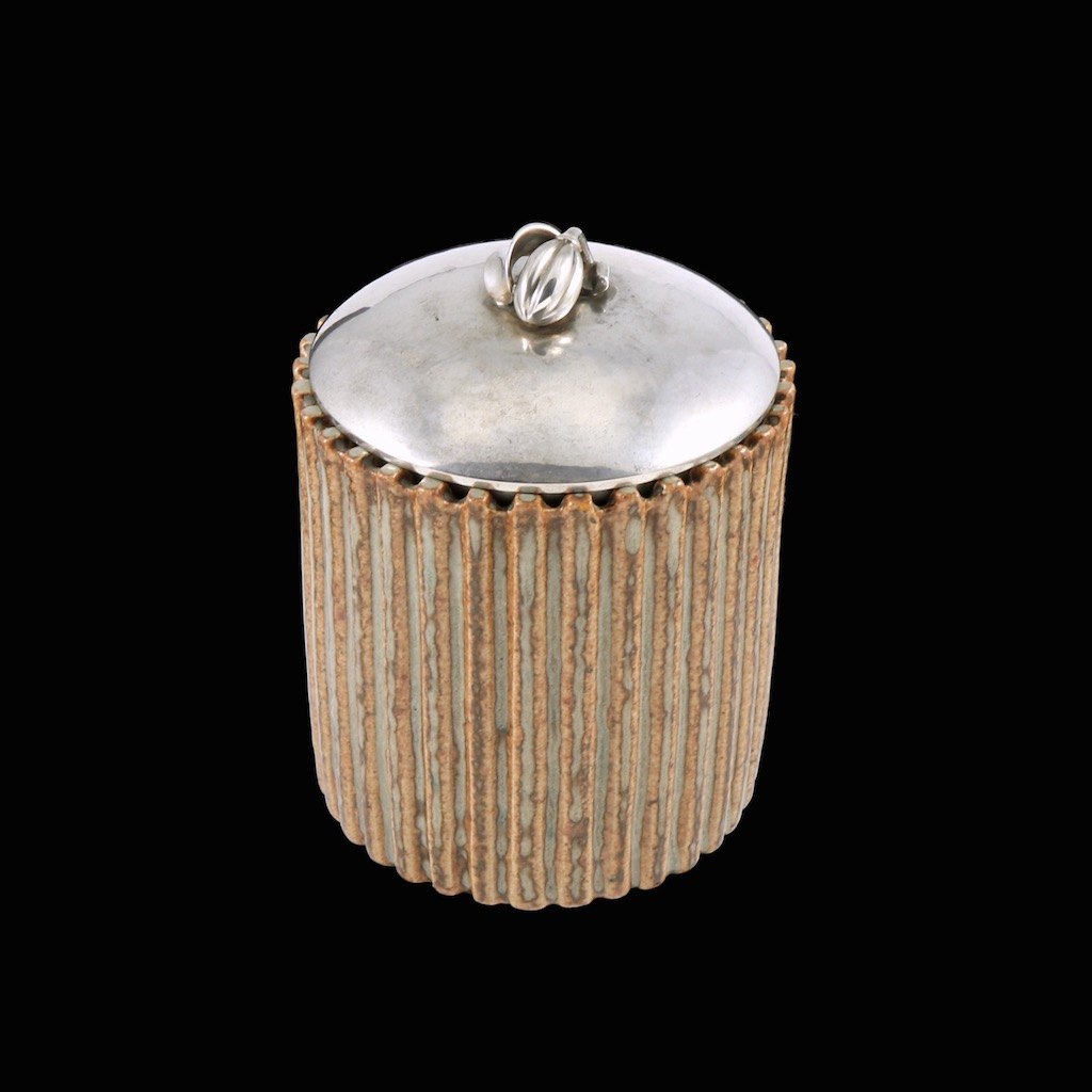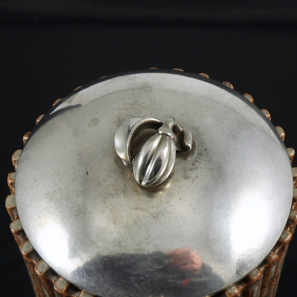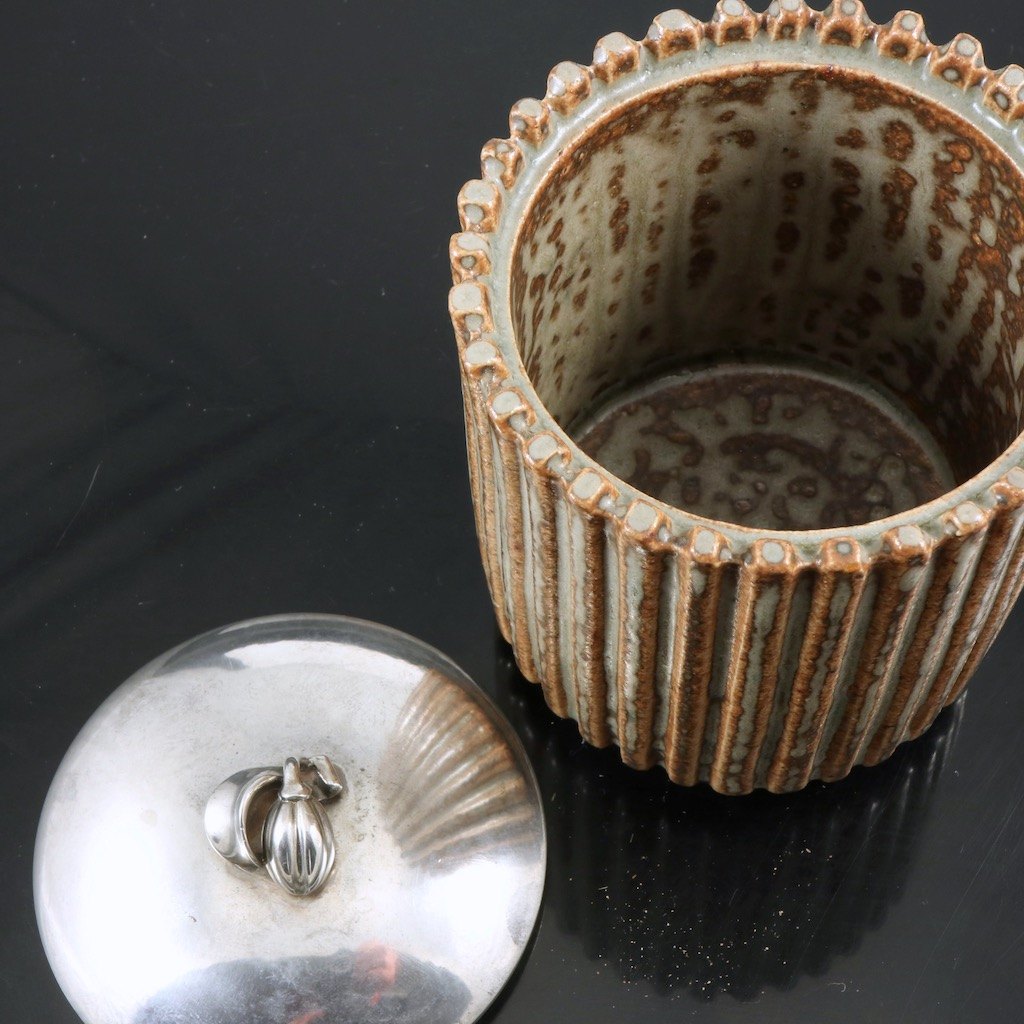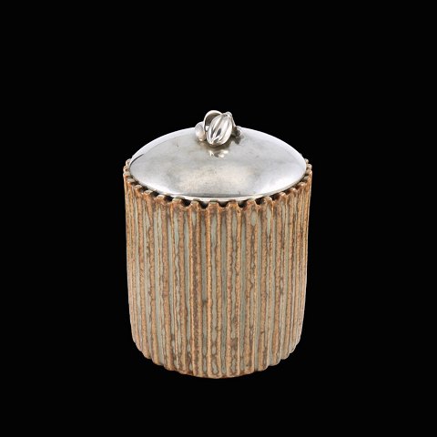 Arne Bang - Evald Nielsen. Krukke i stentøj med låg i sølv.