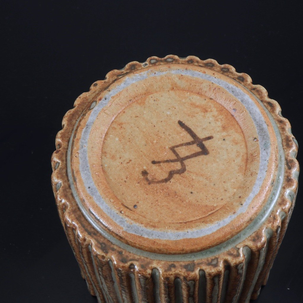 Stentøjskrukke med glasur udført hos Arne Bang (1901 - 1983). Stemplet AB.
