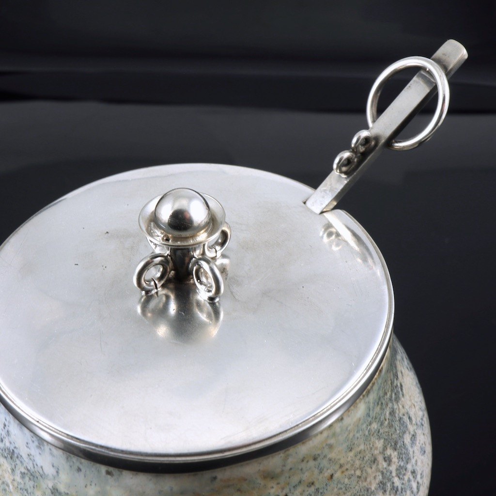 Hans Hansen. Krukke i stentøj med låg og ske i sterlingsølv.