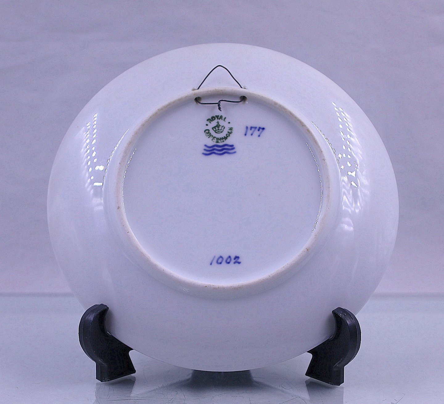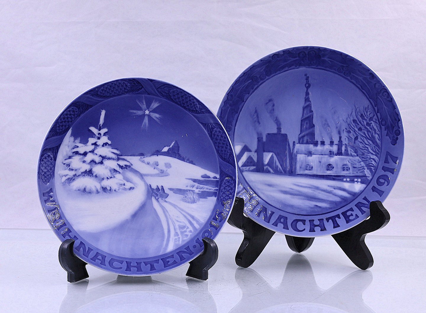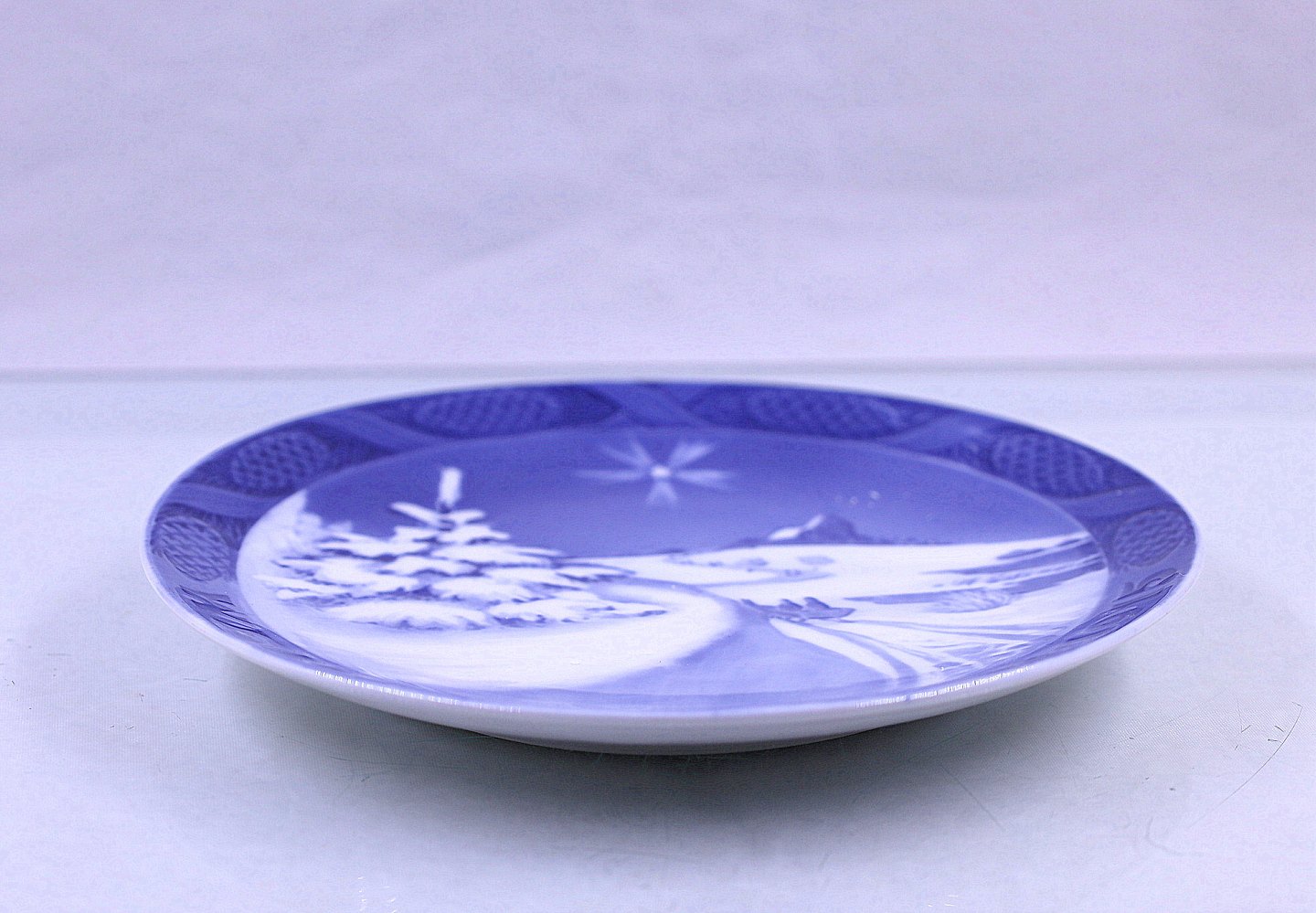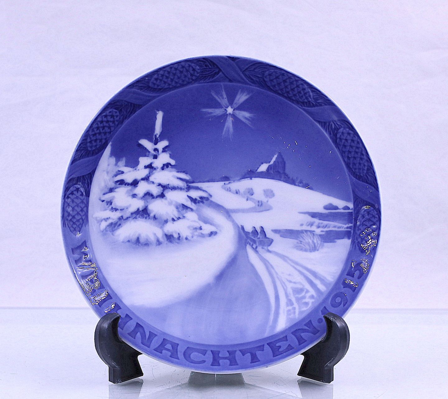 Royal Copenhagen Juleplatte 1915 lavet til det tyske marked, nr. 177/1002. Dansk Snelandskab med gran, kane og kirke. På plattens bort er kogler og årstal.