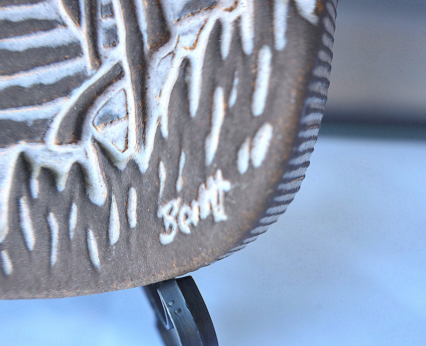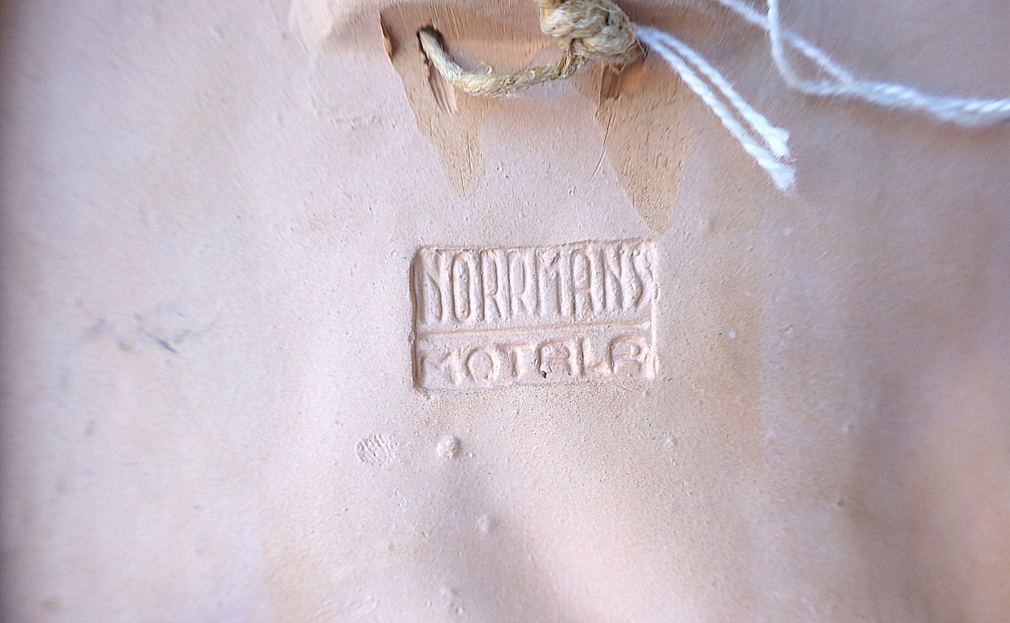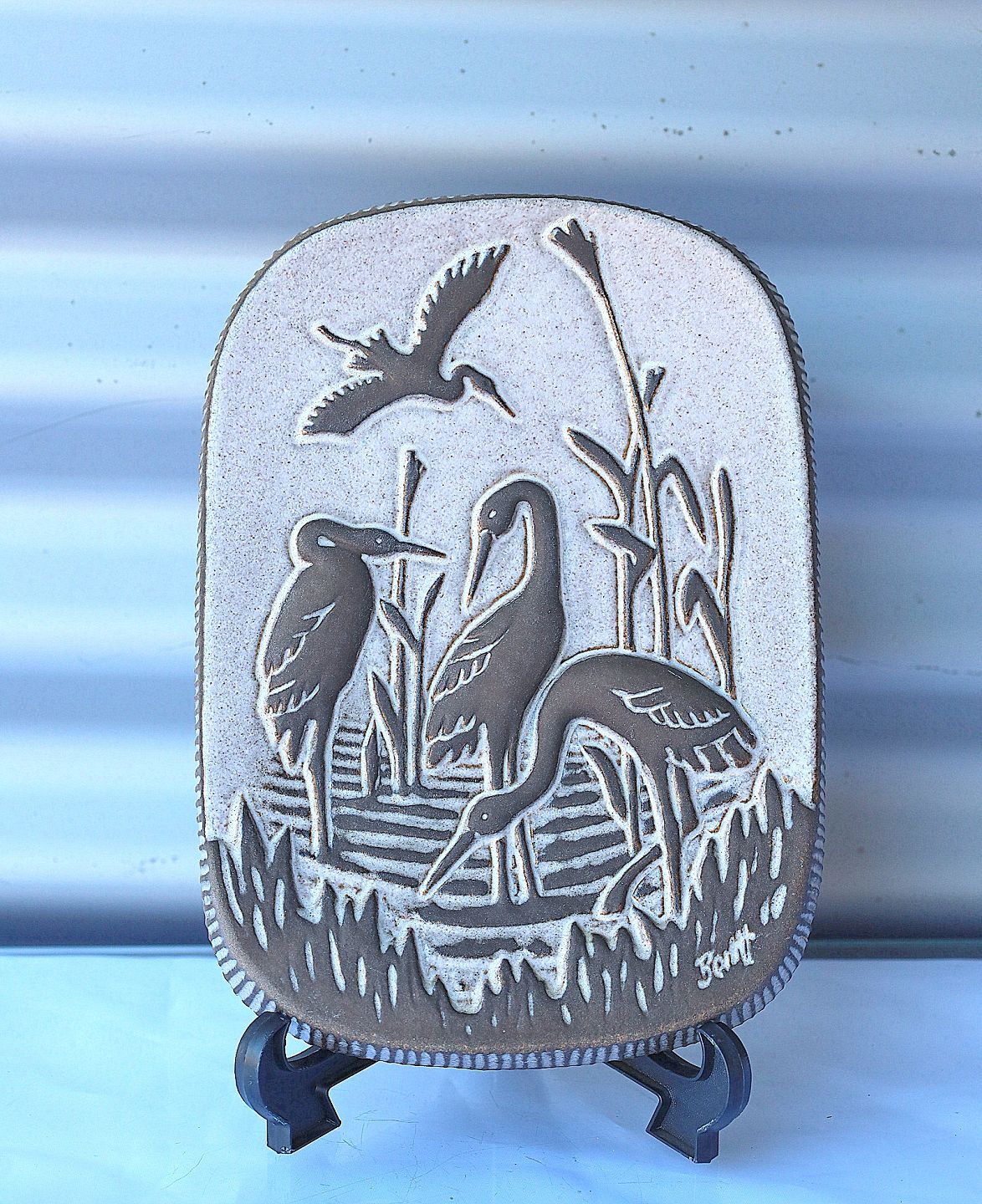 Norrmans Motala relief. Relieffet er af rødler og med hvid glasur, motivet på relieffet er 4 traner i forskellige positurer.