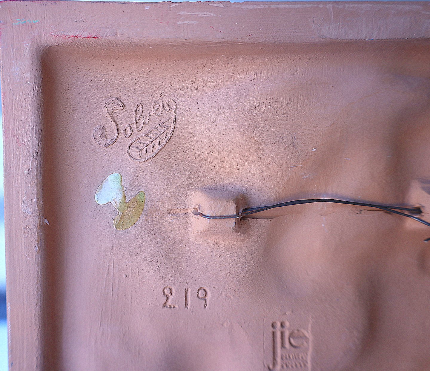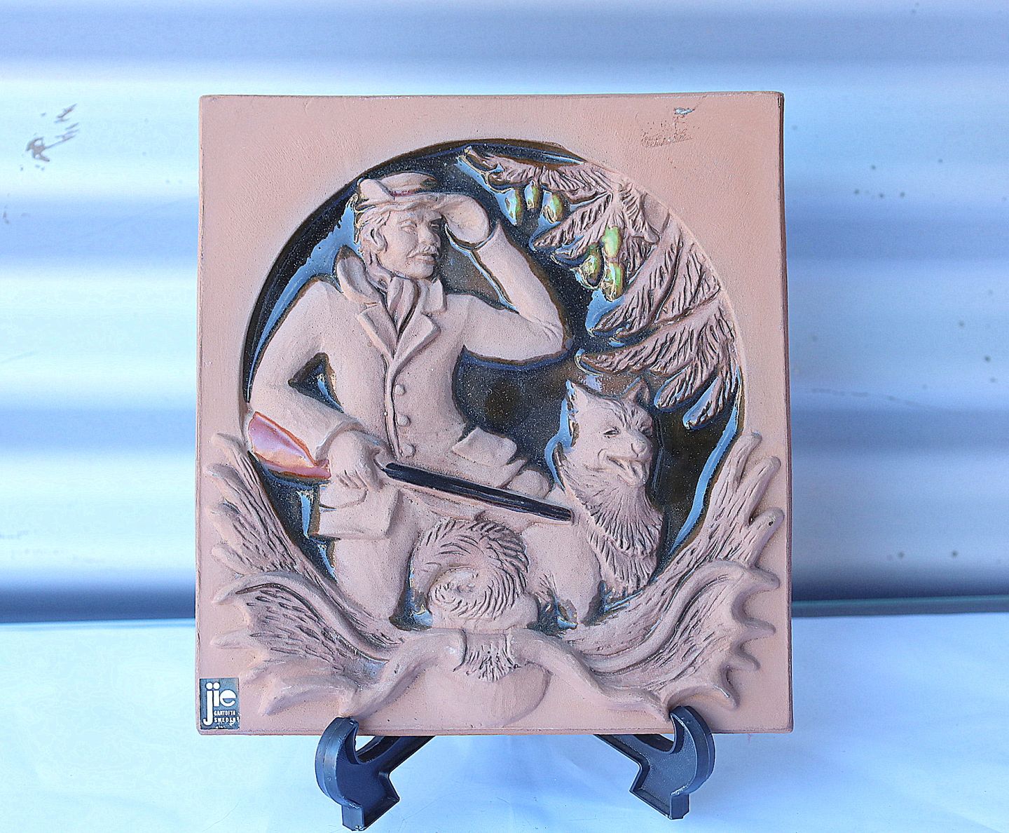 Relief, nr. 219, JIE, Gantofta, Sweden. Relief med motiv af en jæger, med gevær, og hans hund. Relieffet er i rødler og kun, lidt, grøn glaseret.