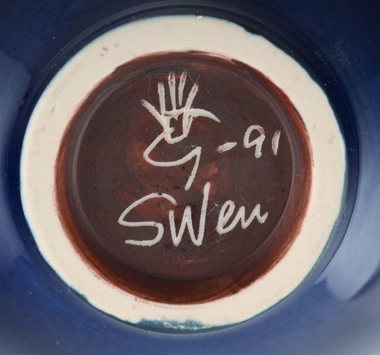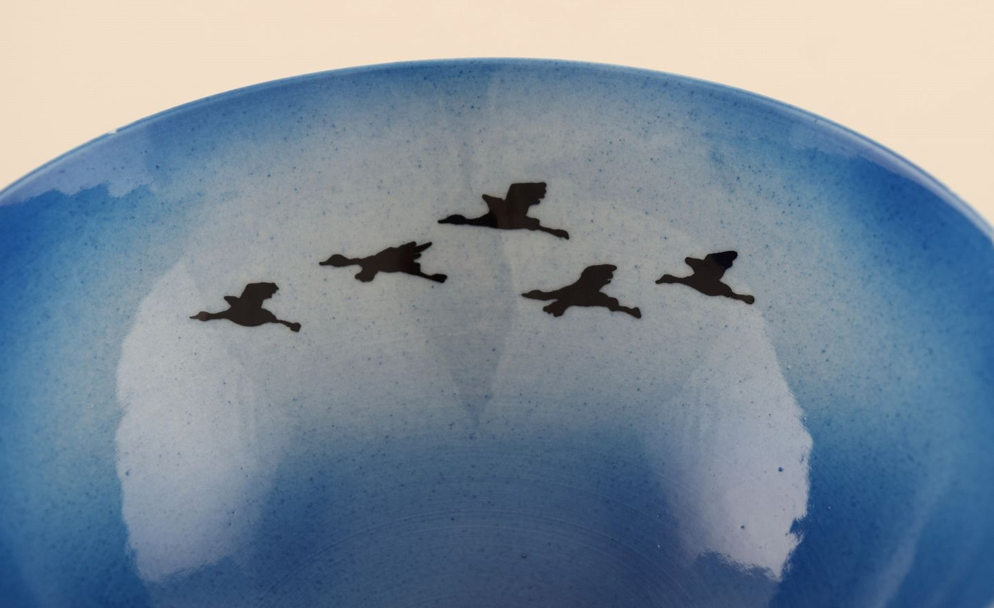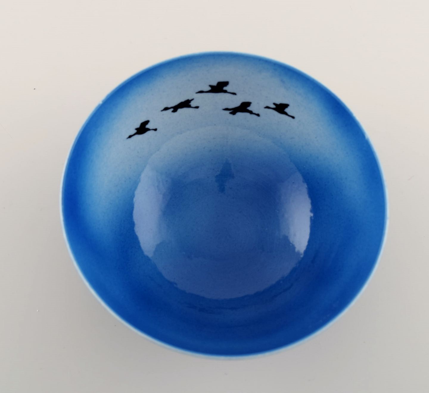 Sven Wejsfelt (1930-2009), Gustavsberg Studiohand. Unika skål i glaseret keramik med håndmalede fugle. Smuk glasur i blå nuancer. Dateret 1991.