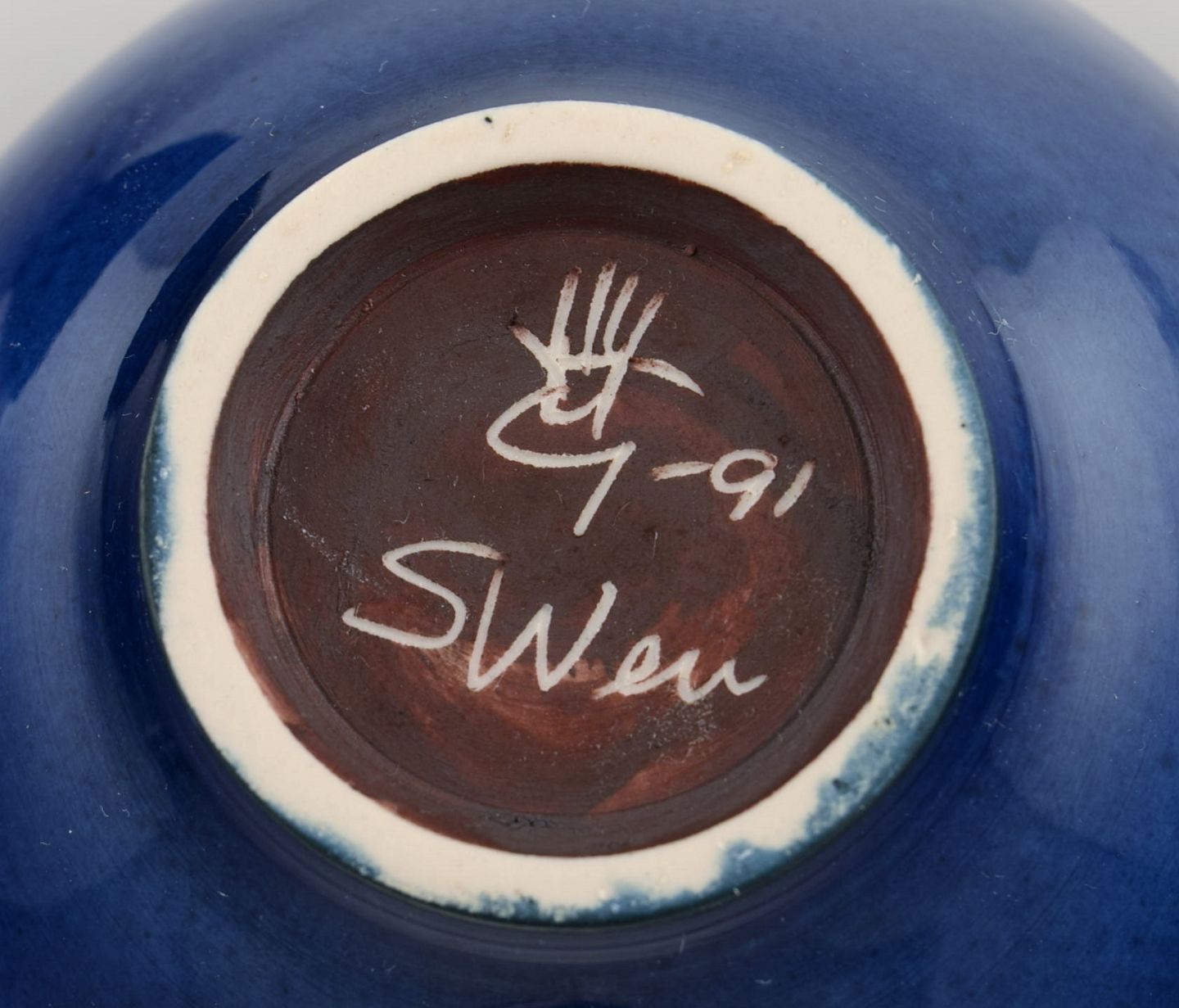 Sven Wejsfelt (1930-2009), Gustavsberg Studiohand. Unique bowl in glazed ceramics with hand-painted birds. Beautiful glaze in shades of blue. Dated 1991.