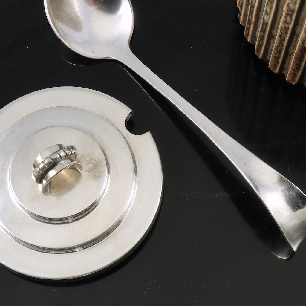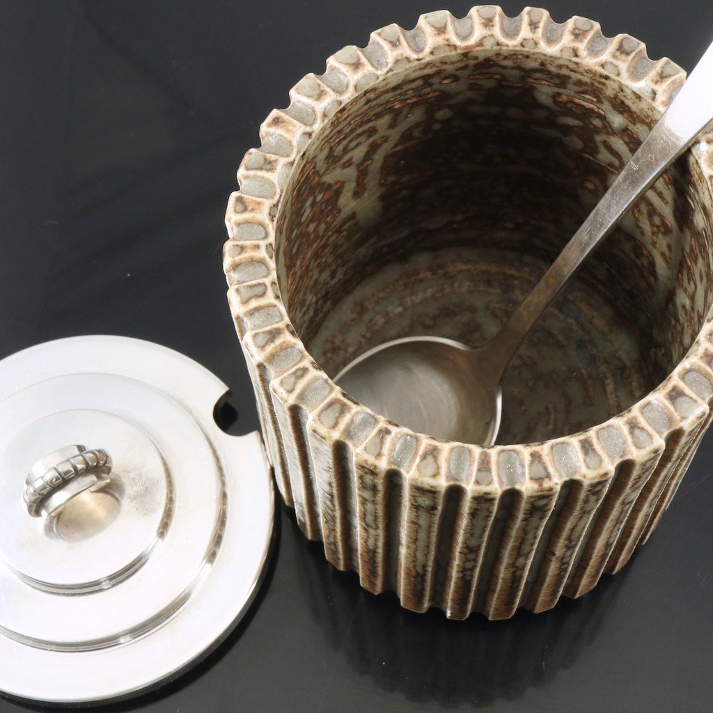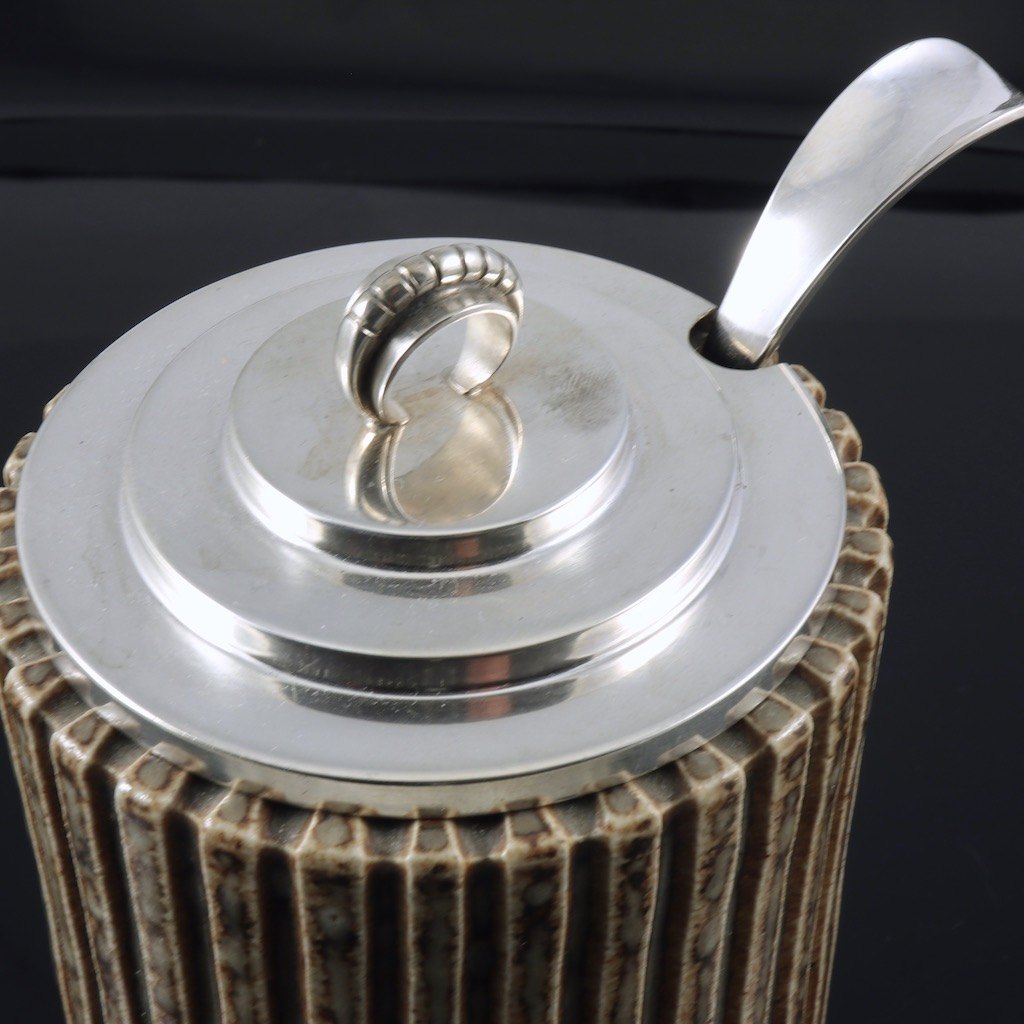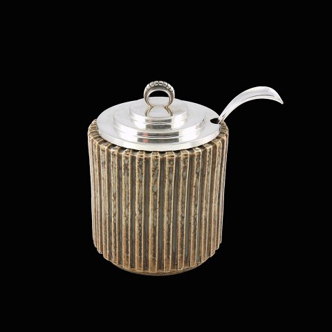 Arne Bang / Villads-Nielsen. Krukke i stentøj med låg samt ske i sterlingsølv.