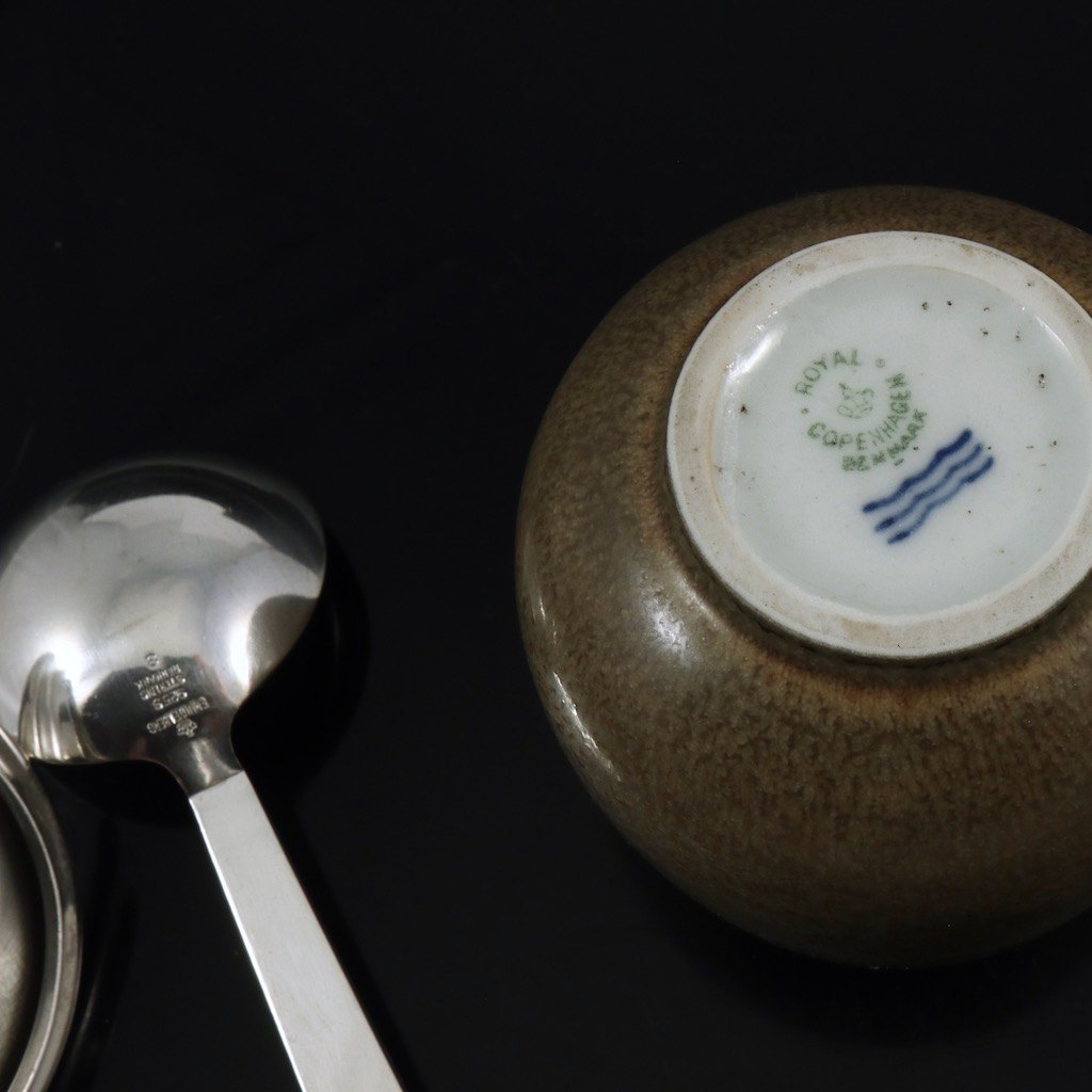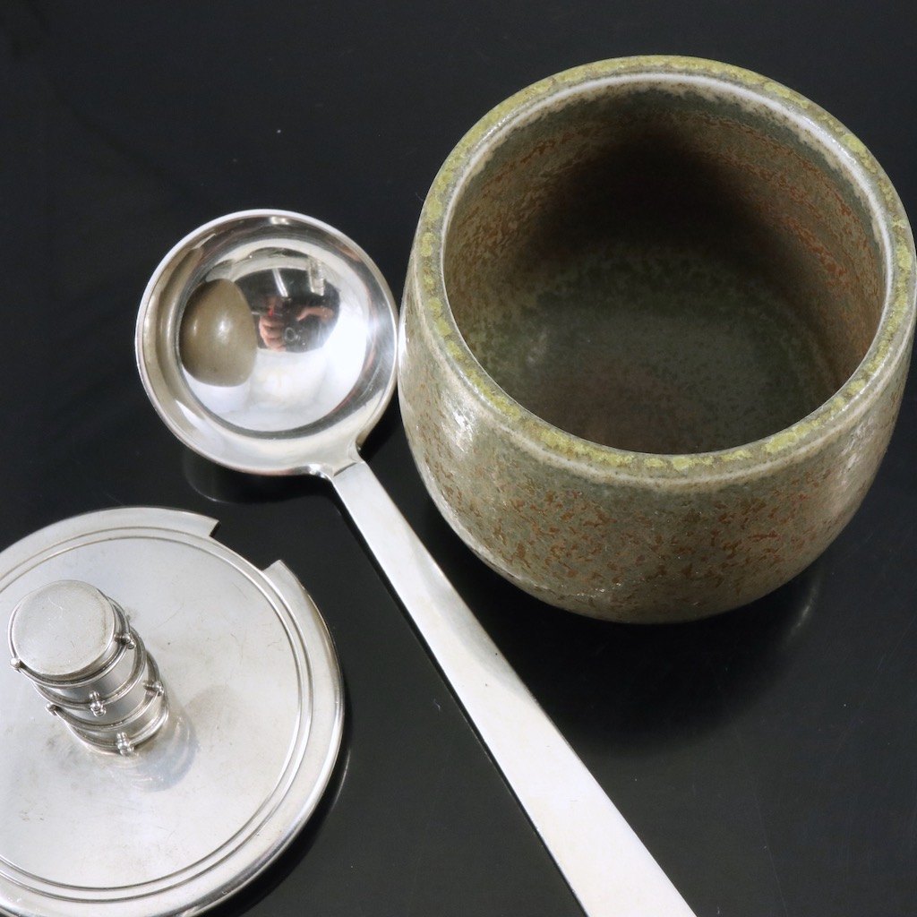 Royal Copenhagen - Hingelberg. Krukke i stentøj med låg og ske i sterlingsølv.