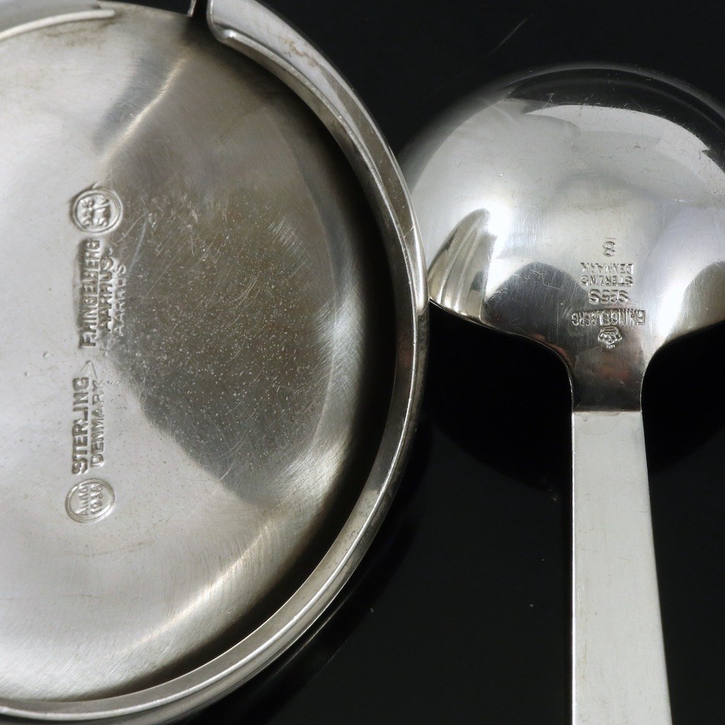 Låg og ske i sterlingsølv tegnet af Svend Weihrauch (1899-1962) og udført hos F. Hingelberg in Aarhus, Denmark.