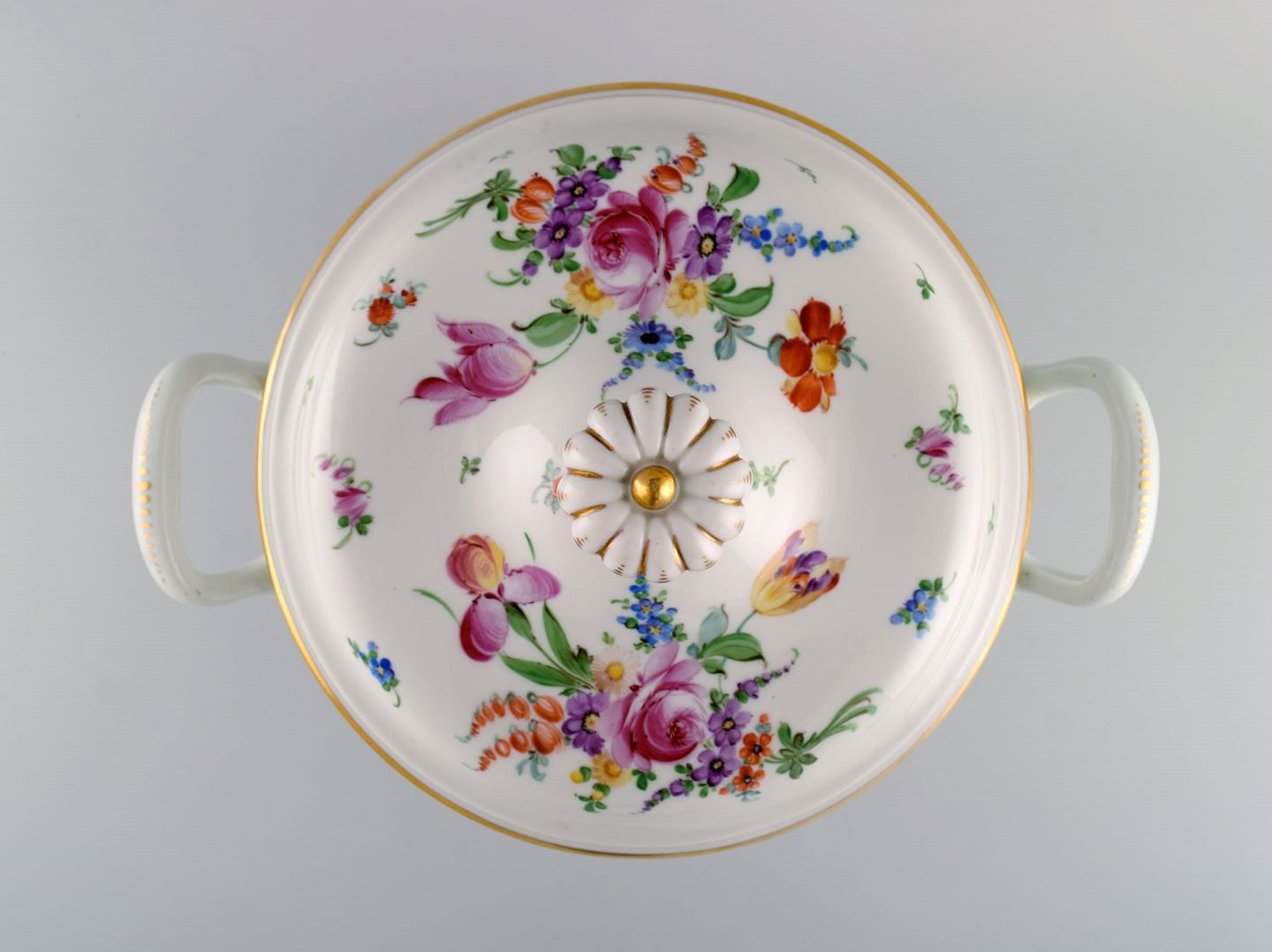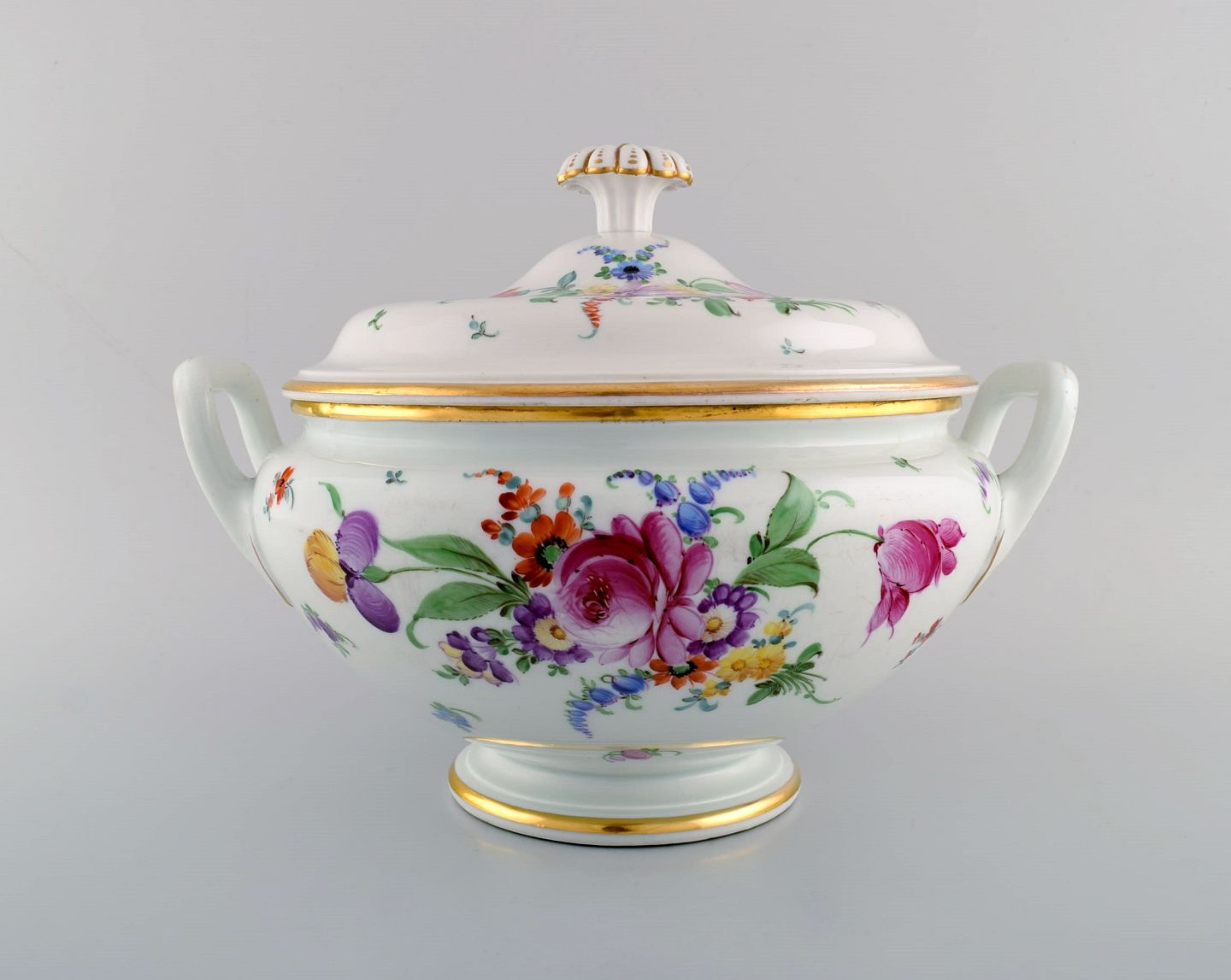 Stor antik Meissen suppeterrin i porcelæn med håndmalede blomster og gulddekoration. Sent 1800-tallet.