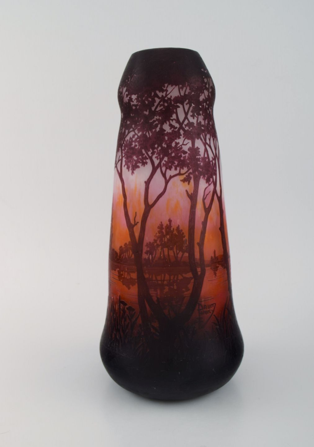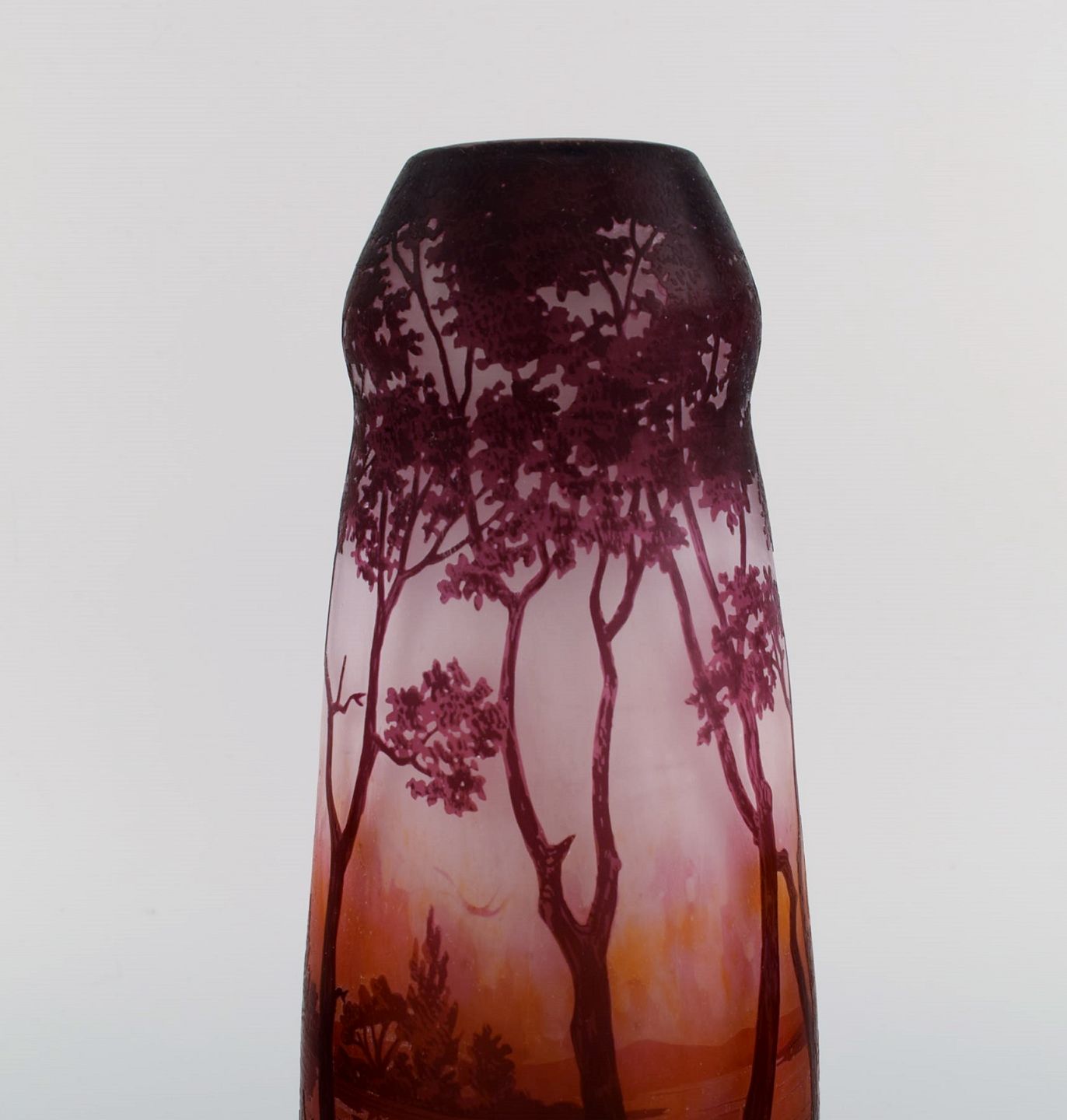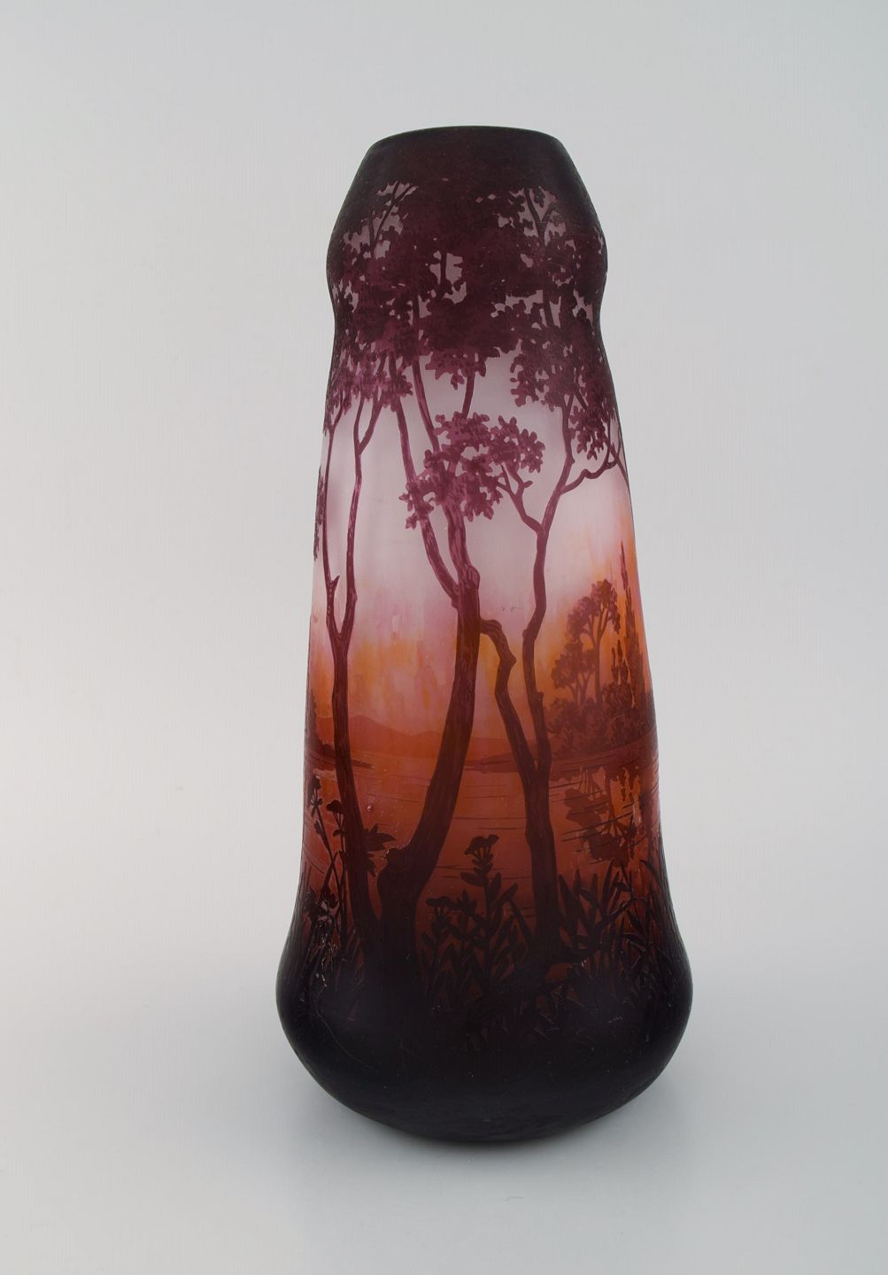 Daum Nancy, Frankrig. Stor antik vase i mundblæst kunstglas dekoreret med sølandskab og træer. Ca. 1910.