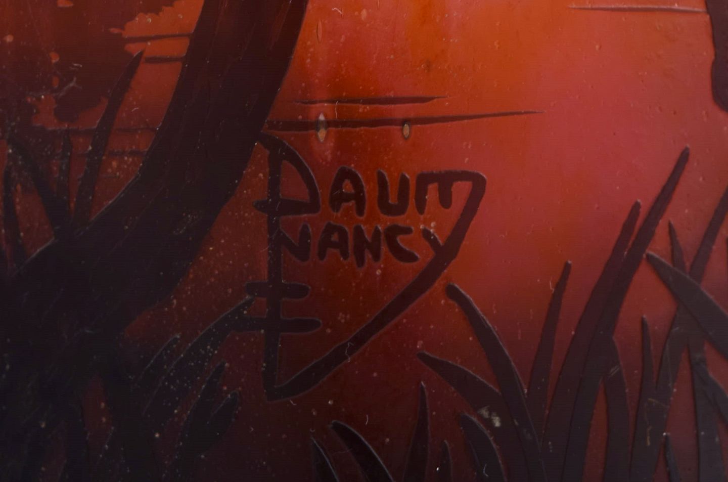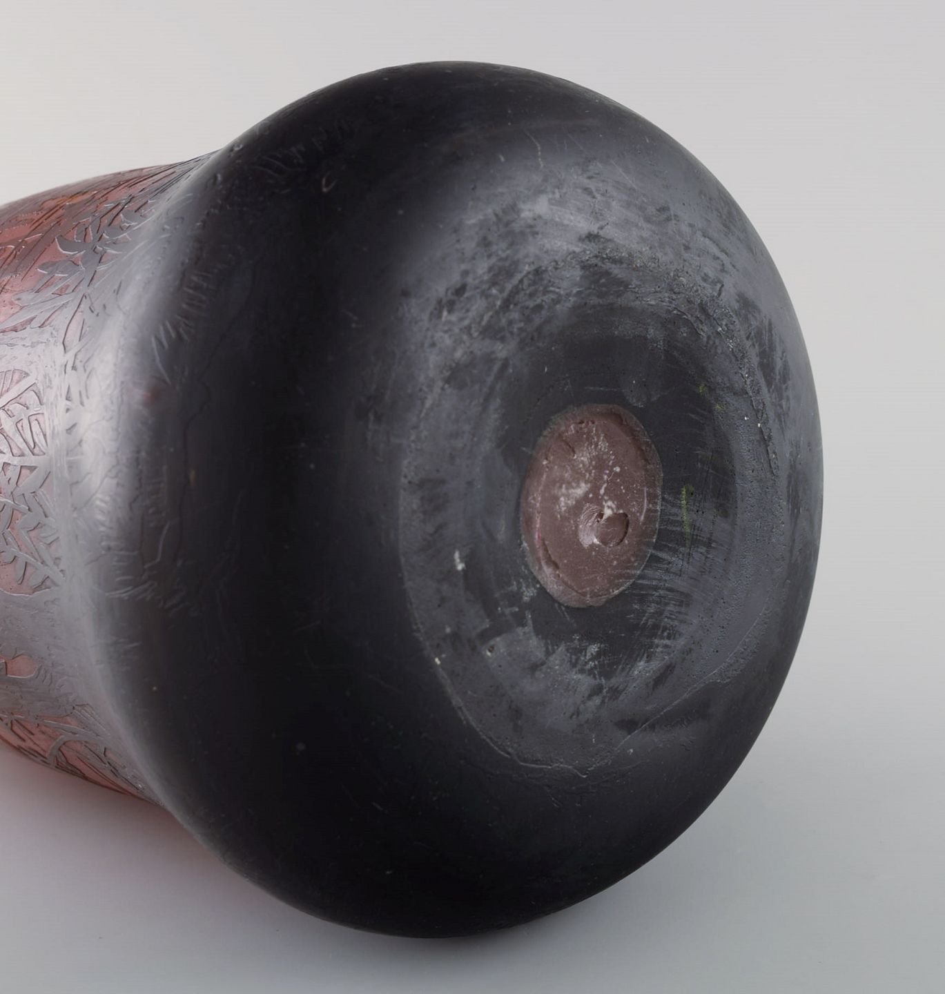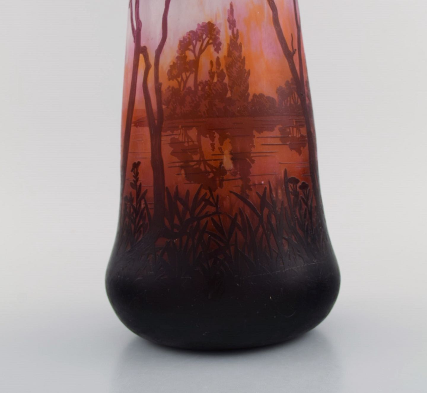 Daum Nancy, Frankrig. Stor antik vase i mundblæst kunstglas dekoreret med sølandskab og træer. Ca. 1910.