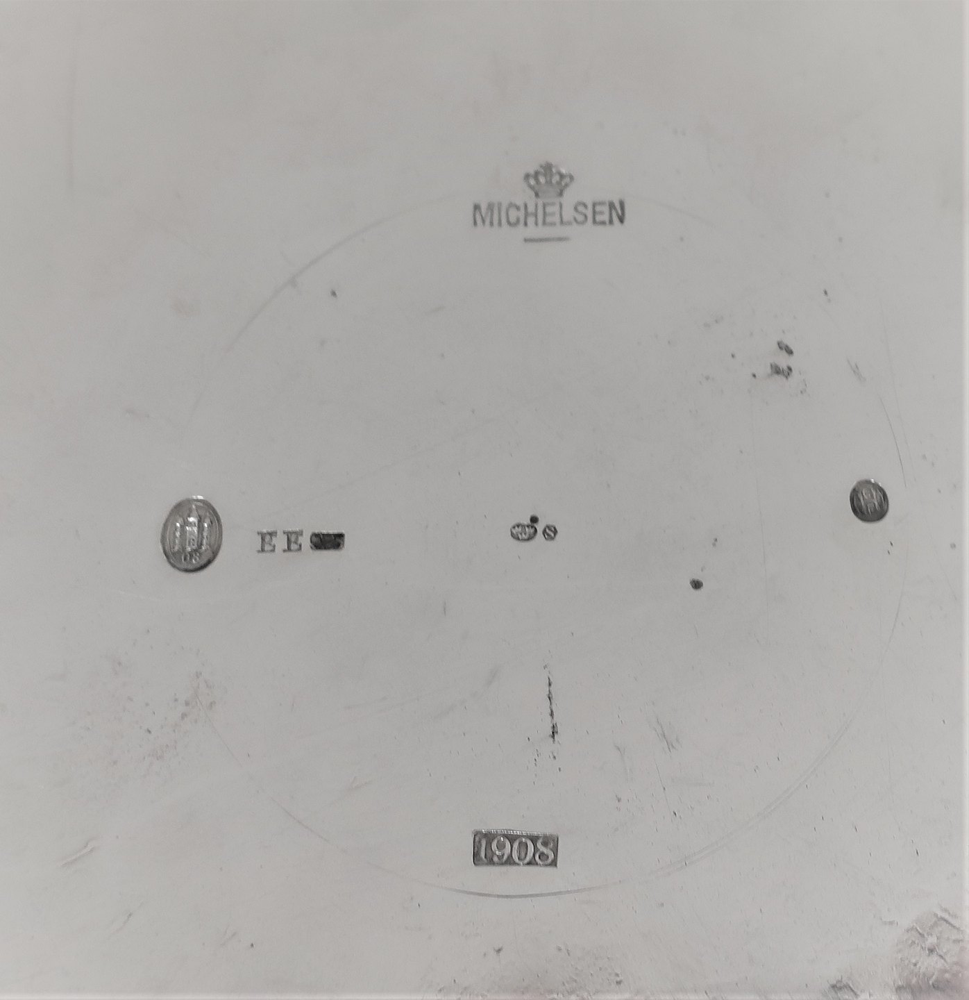Michelsen. Rundt sølv lågfad (925). Diameter 23 cm. Indvendigt forgyldt. Produceret 1908.