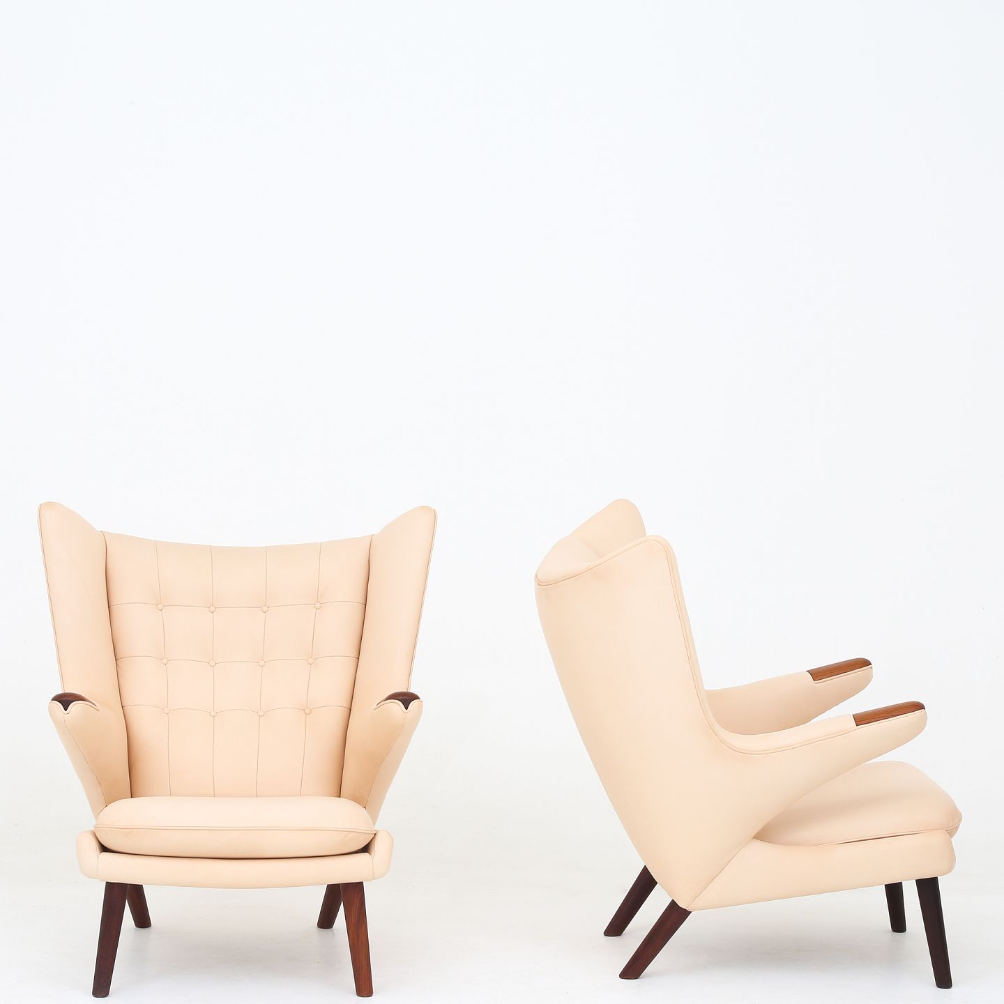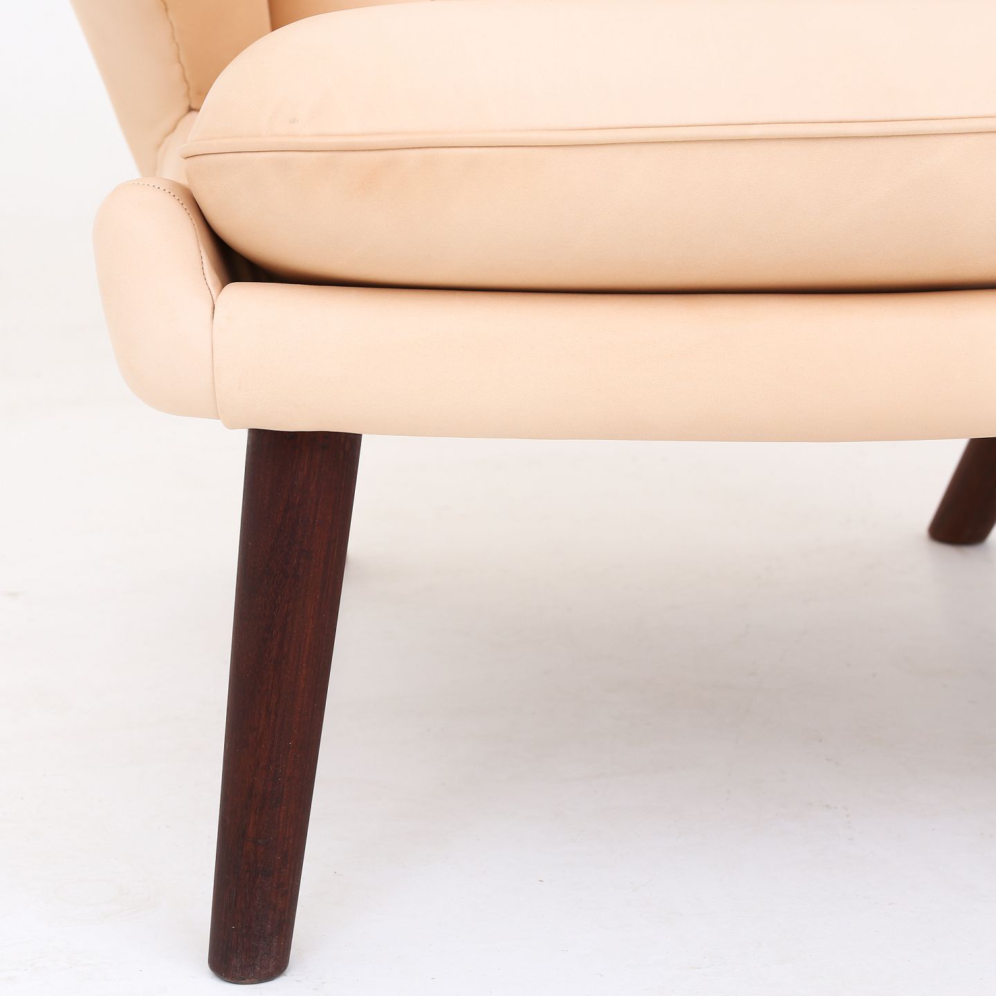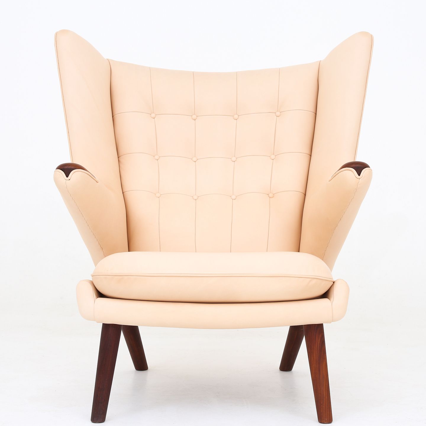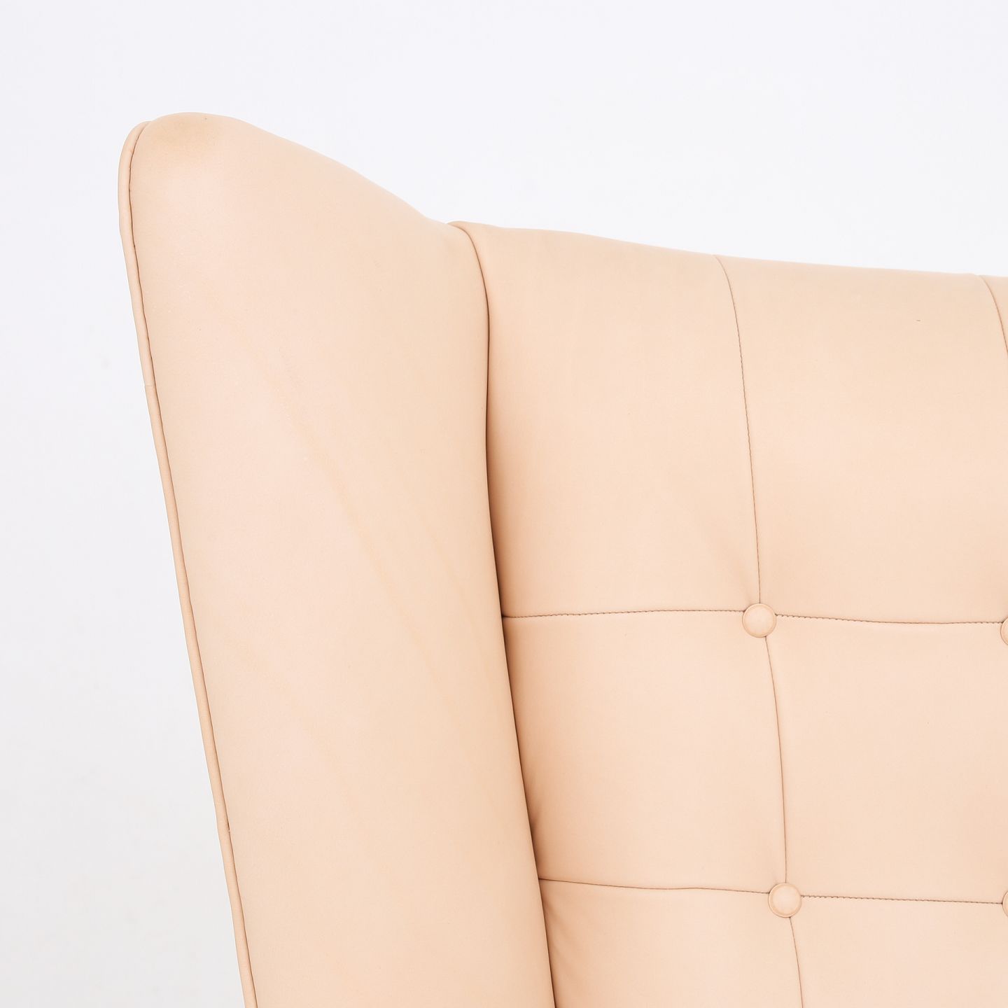 AP 19 - Nybetrukket Bamsestol i vegetal-læder/naturlæder med mørke ben og poter. KLASSIK tilbyder polstring af Bamsestolen med stof eller læder efter eget valg. Kontakt os venligst for mere information.