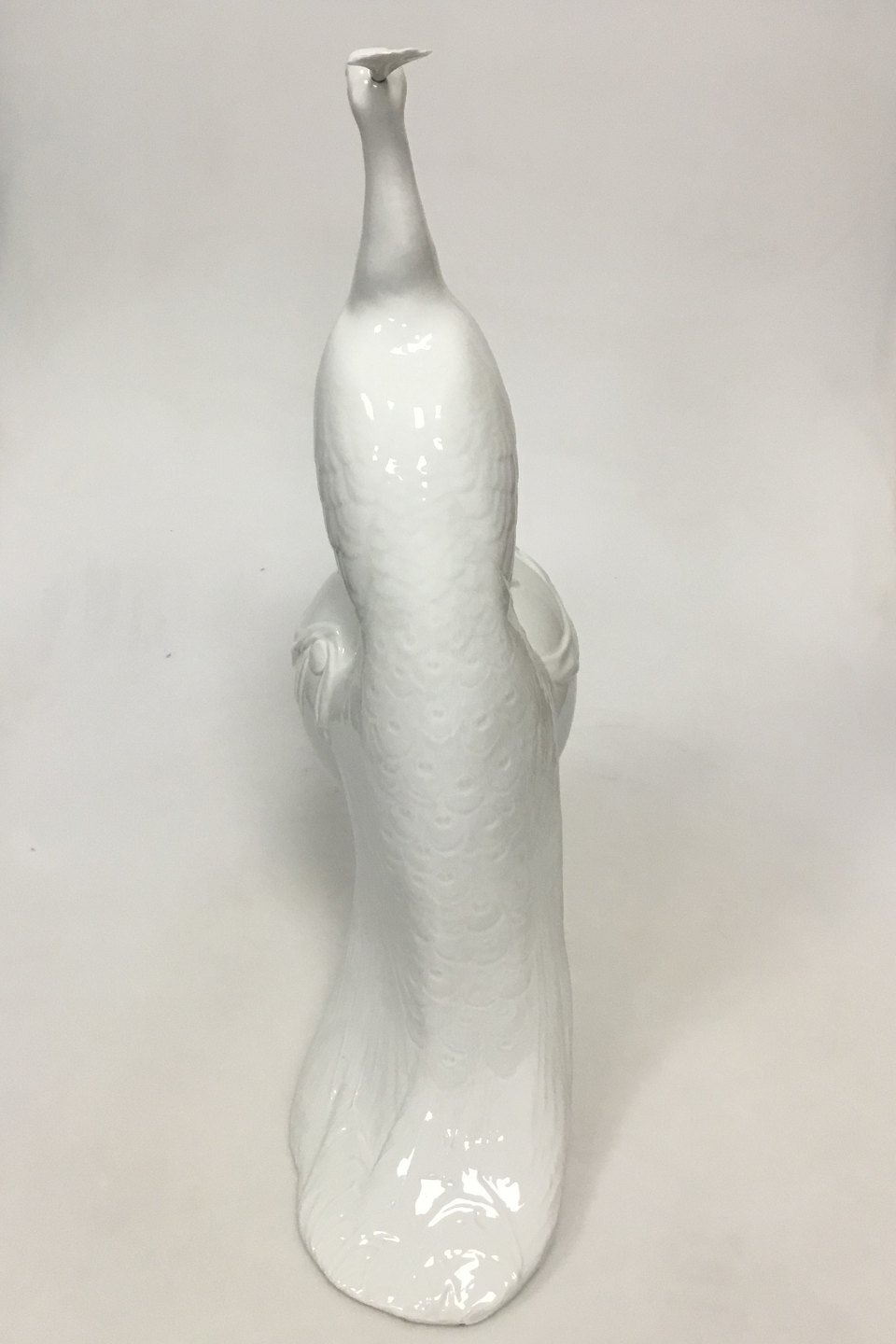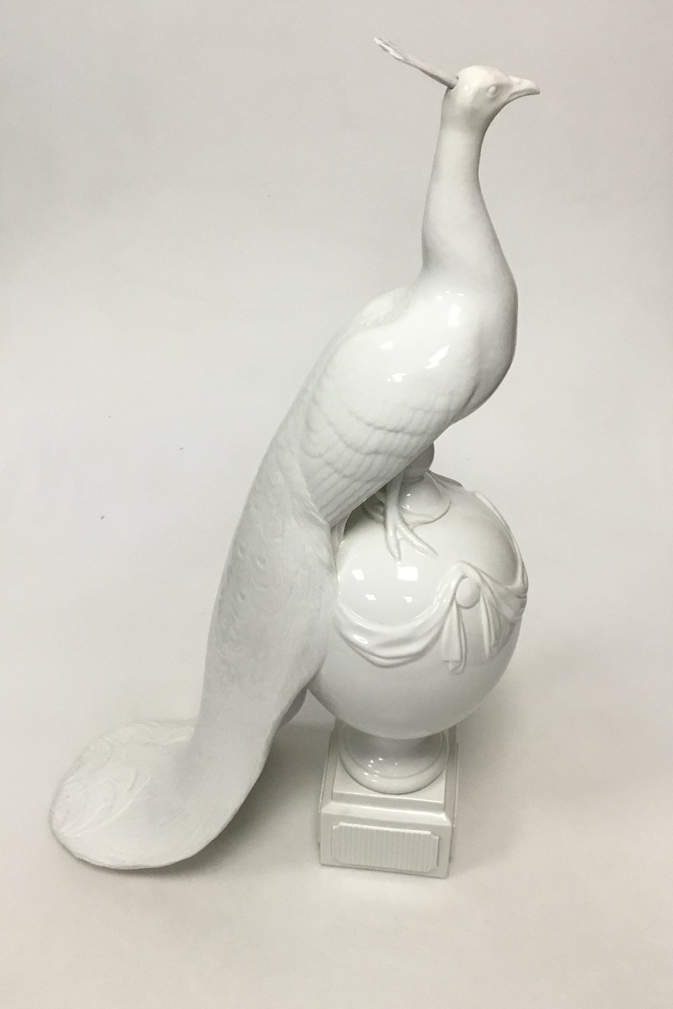 Royal Copenhagen Figurine of Peacock on ball. Designed by Arnold Krog. Measures 55 cm / 21 21/32 in. 2nd Quality. The figurine is a bit crooked. Top feathers on peacocks head can be taken off.