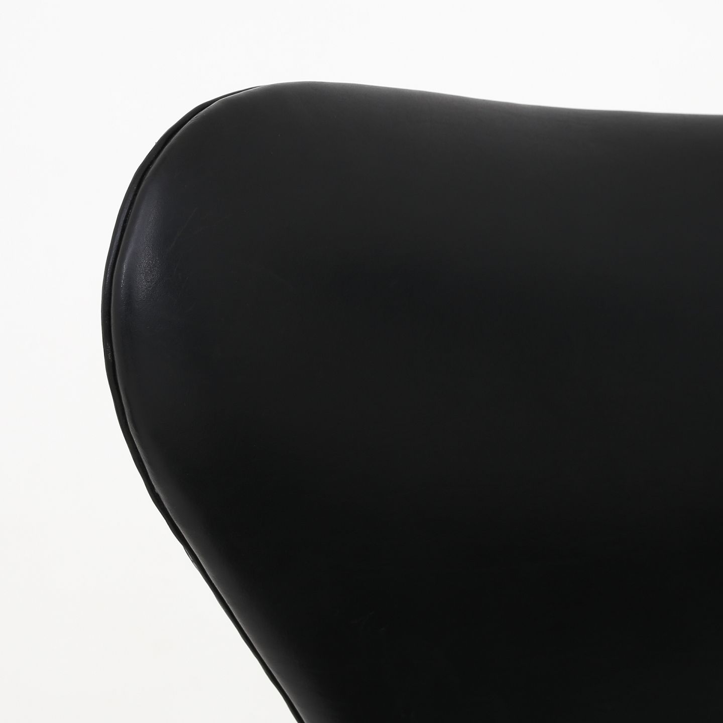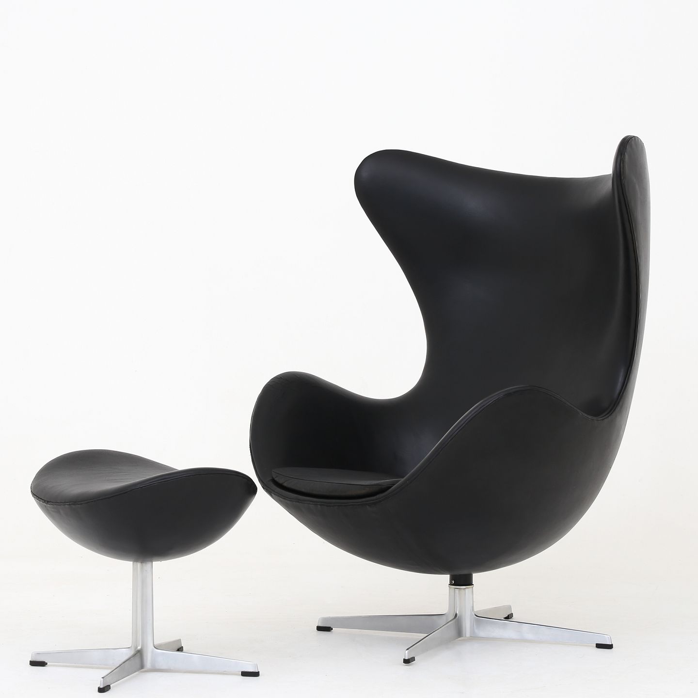 AJ 3316 - 'Ægget' lænestol m. skammel i originalt, sort læder på gammel fod af aluminium.