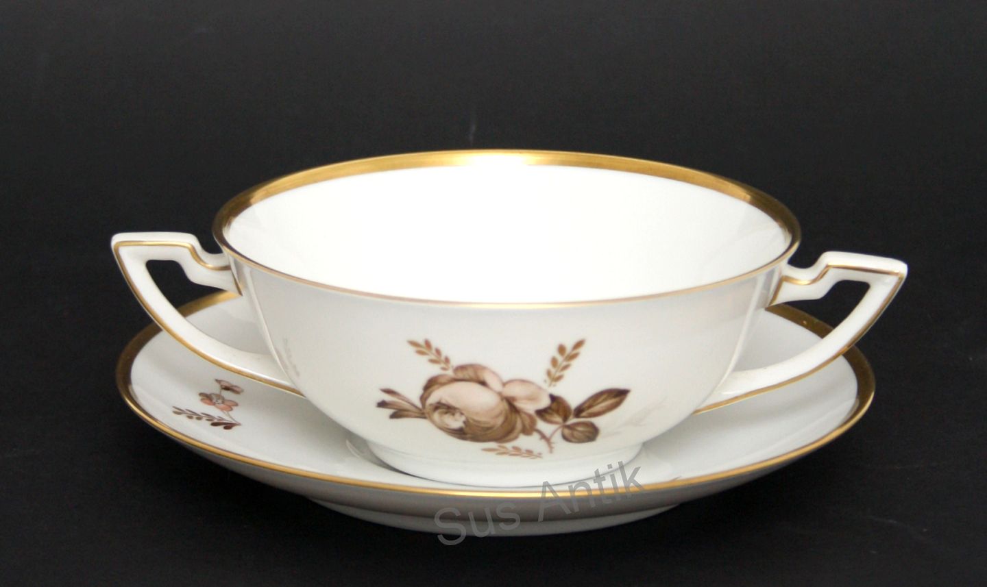 Royal Copenhagen, Brun Rose, Boullionkop. Nr. 688/9571. Højde 5 cm. Diameter 13 cm. Længde 17,5 cm. Underkop diameter 17 cm.