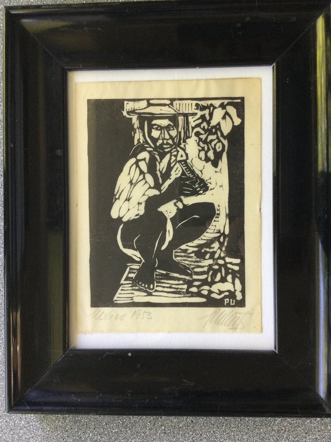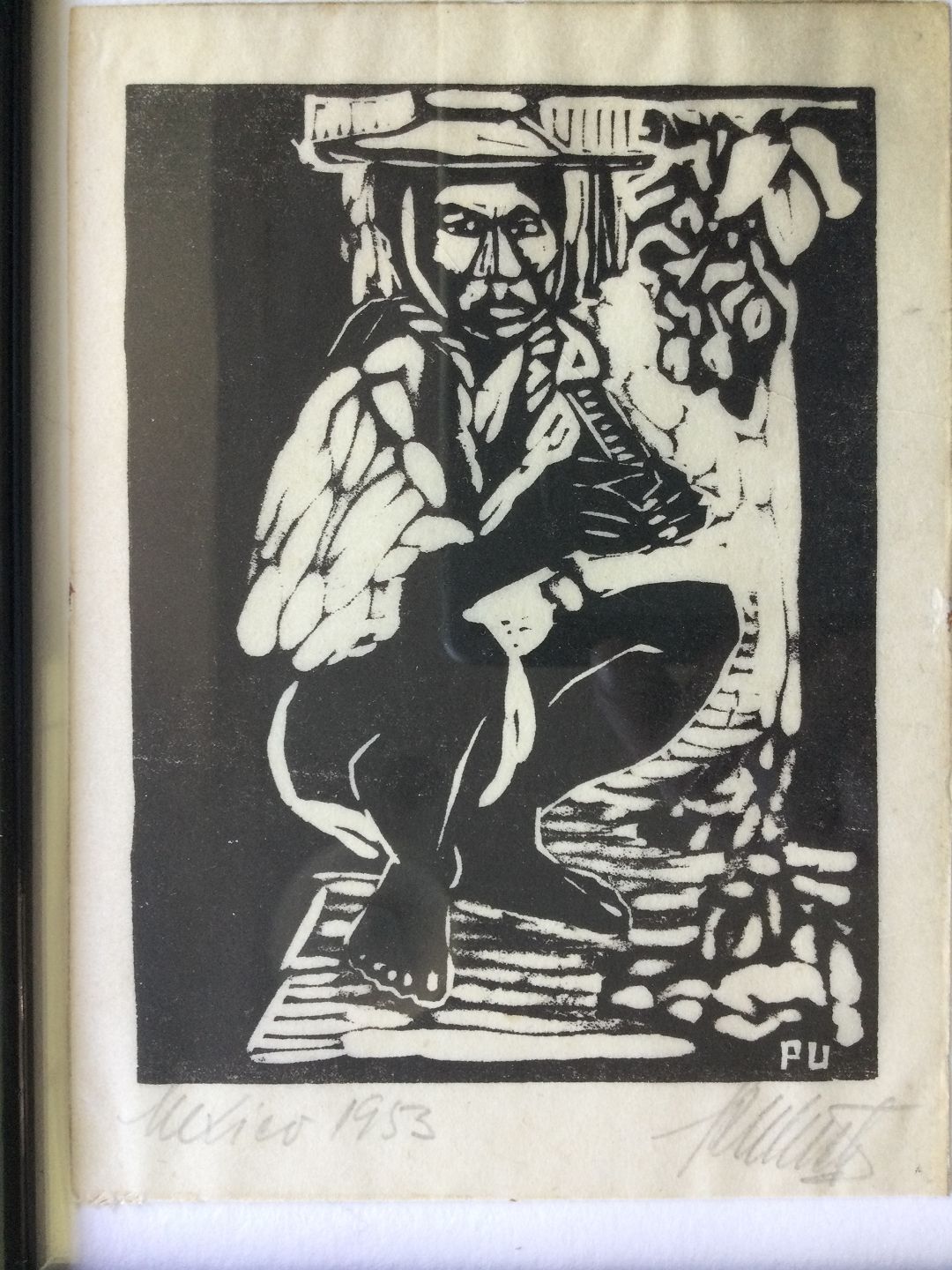Linoleumssnit af Per Ulrich - Indianer på hug, Mexico 1953.