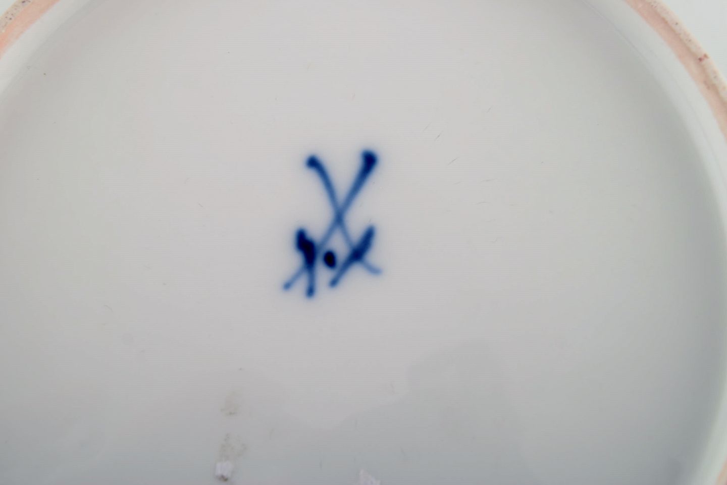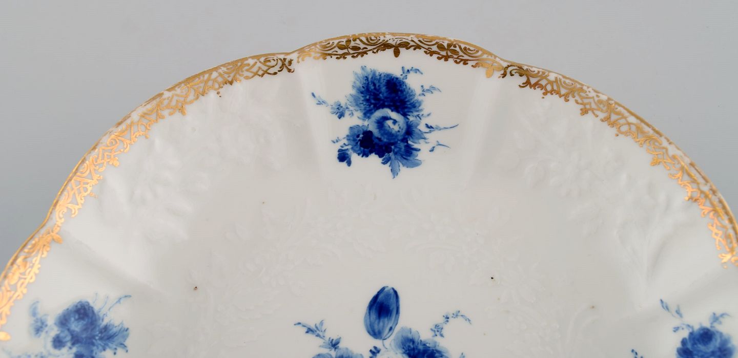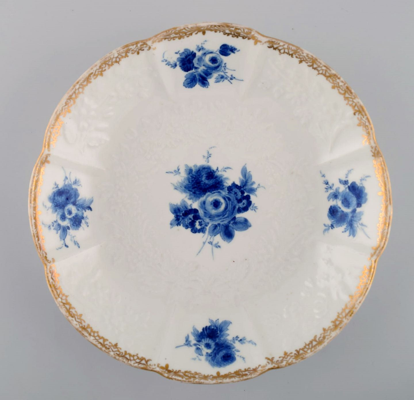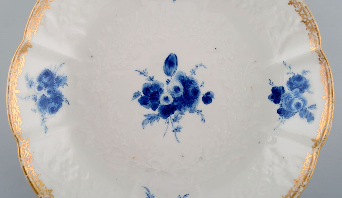 To antikke Meissen dybe tallerkener med bladværk i relief, håndmalede blomster og guldkant. Dateret 1732-1773.