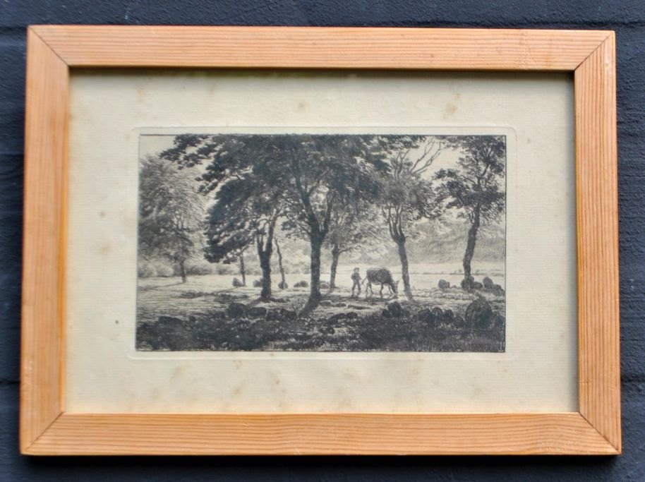 Skovgaard, Niels Christian (1858 - 1938) Danmark.En mand med en ko på vejen. Radering. Signeret: Monogram 1899. 12,5 x 20 cm.