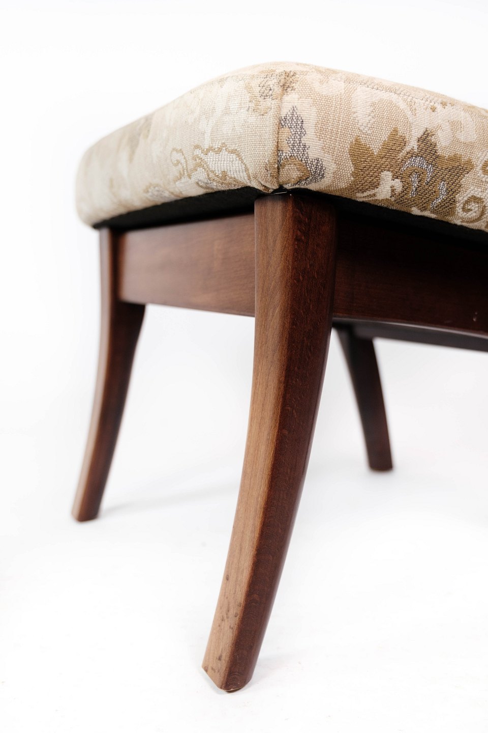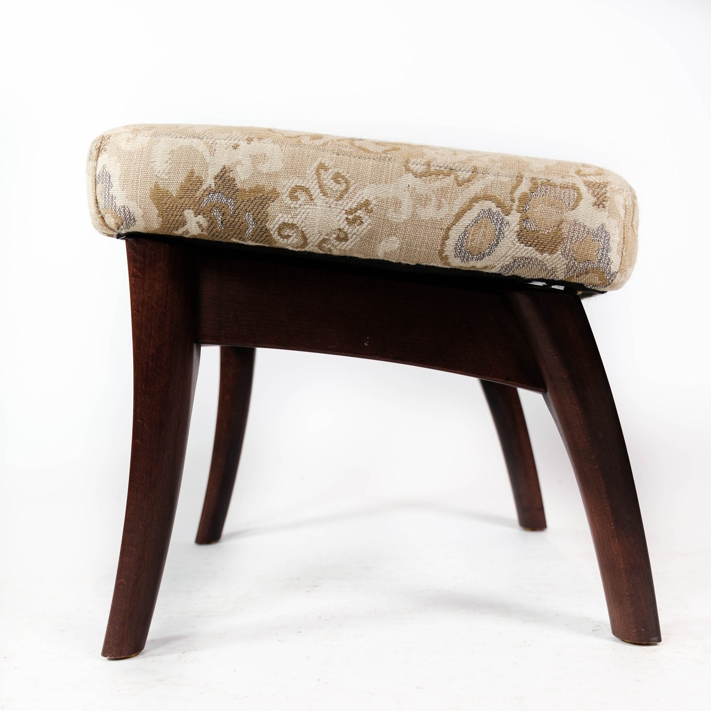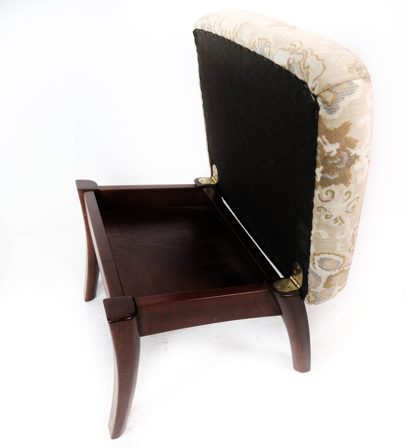 Skammel med opbevaring af mahogni og polstret med lyst stof fra 1960erne.