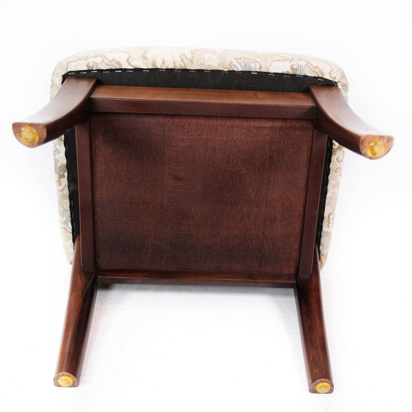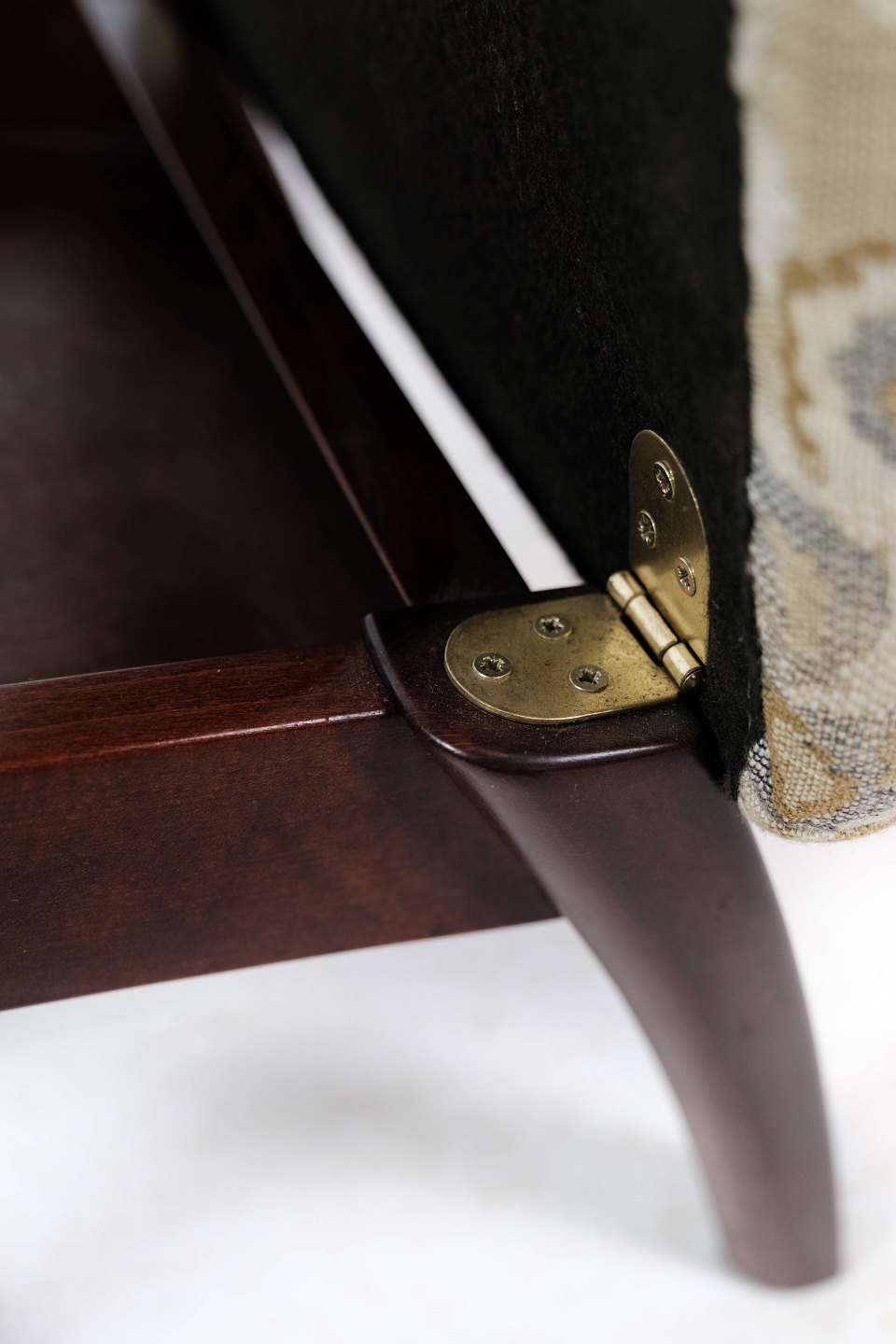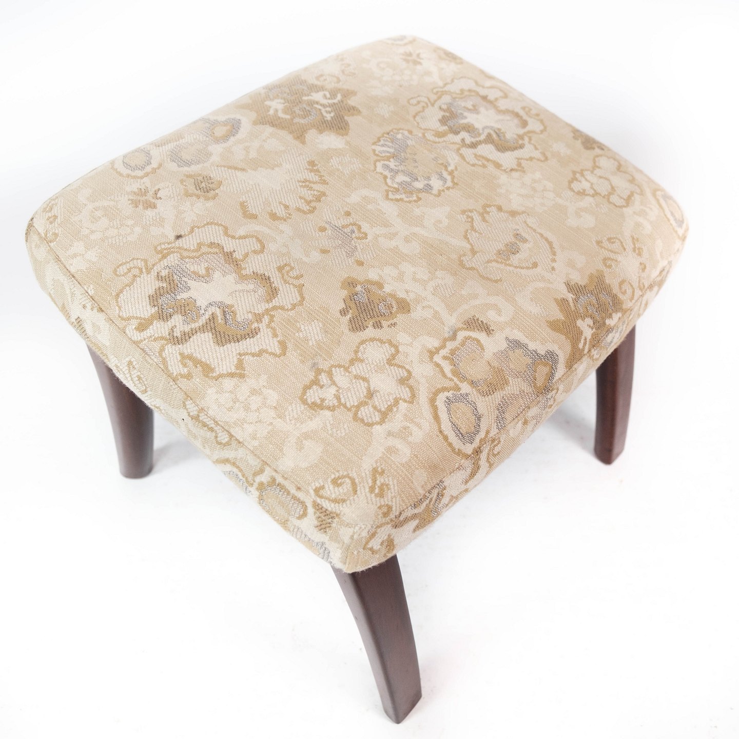 Skammel med opbevaring af mahogni og polstret med lyst stof fra 1960erne.