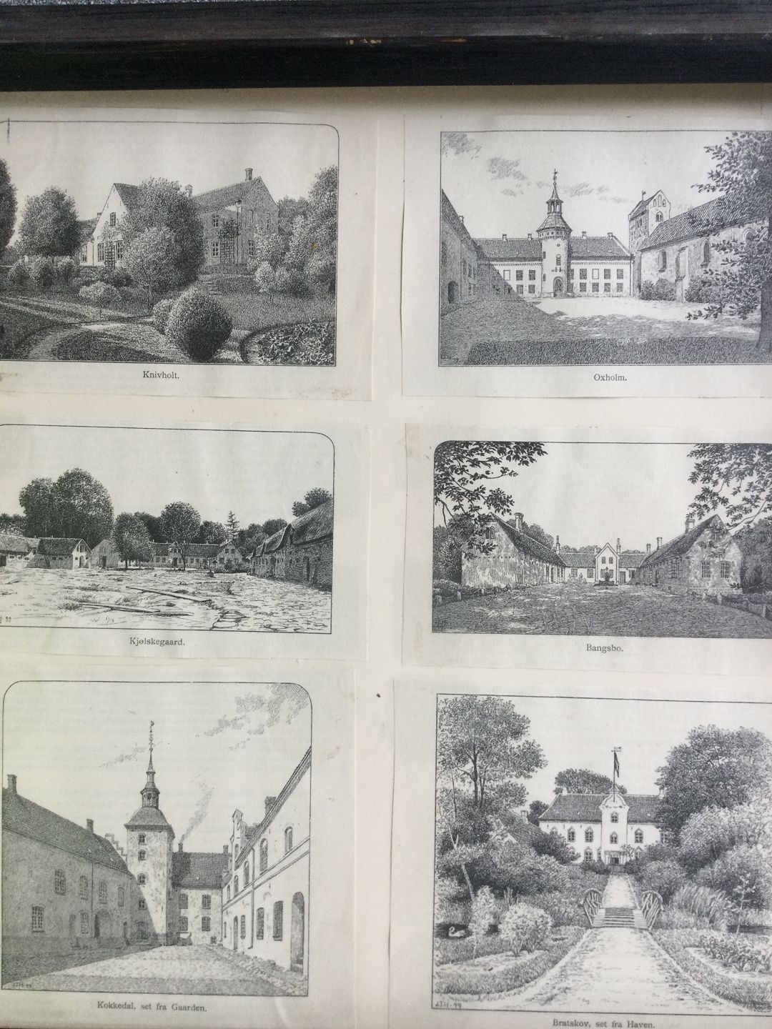 6 små xylografier af Herregårde i Vendsyssel år ca 1900.