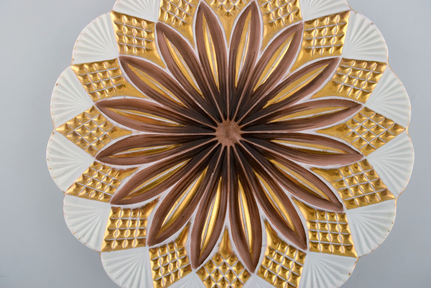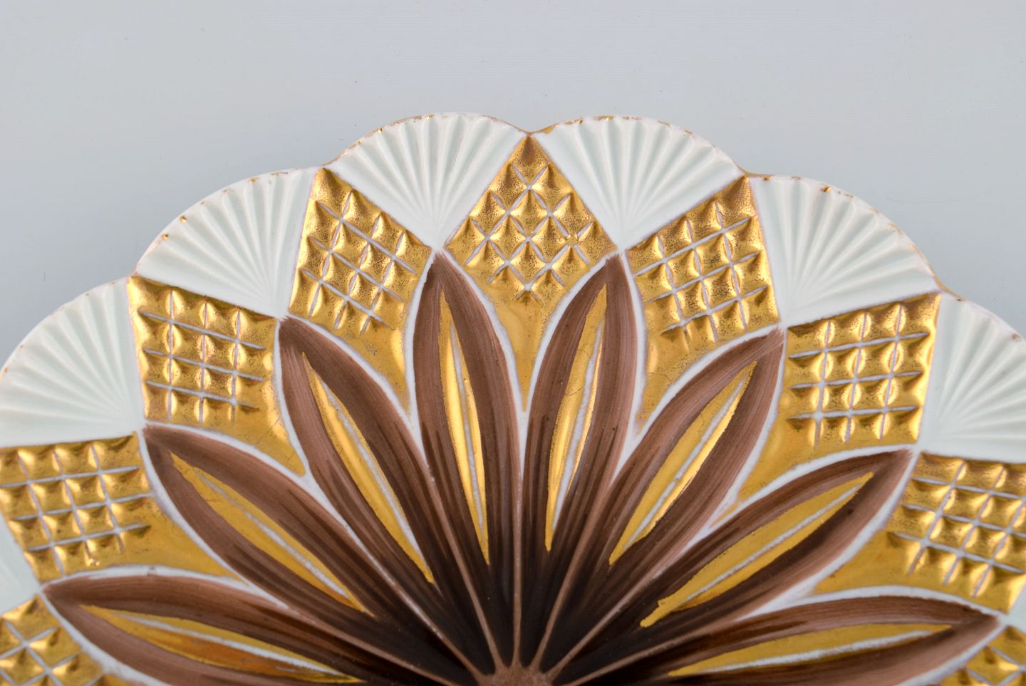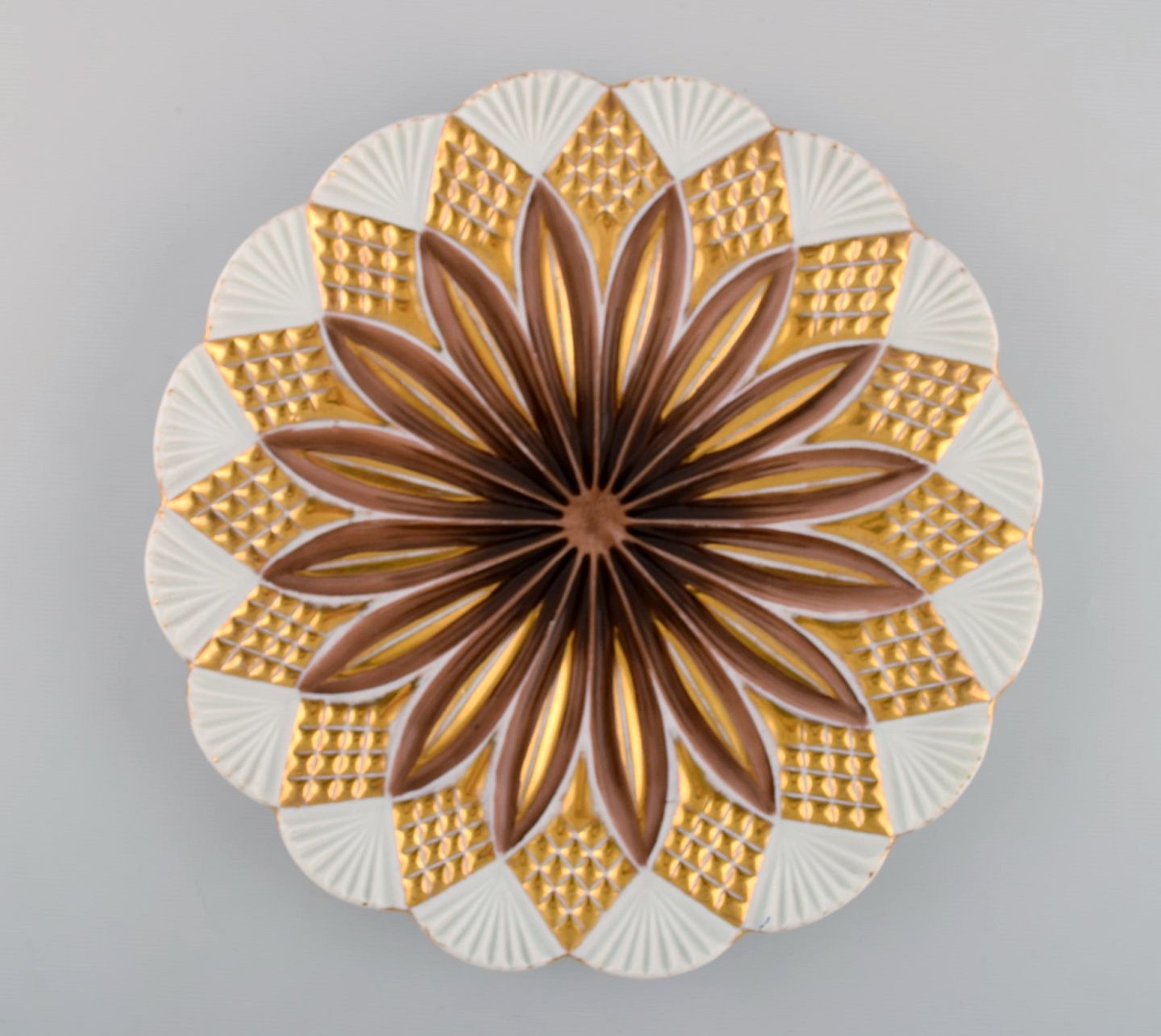Two antique Meissen plates in hand-painted porcelain. Light brown flowers and gold decoration. Early 20th century.