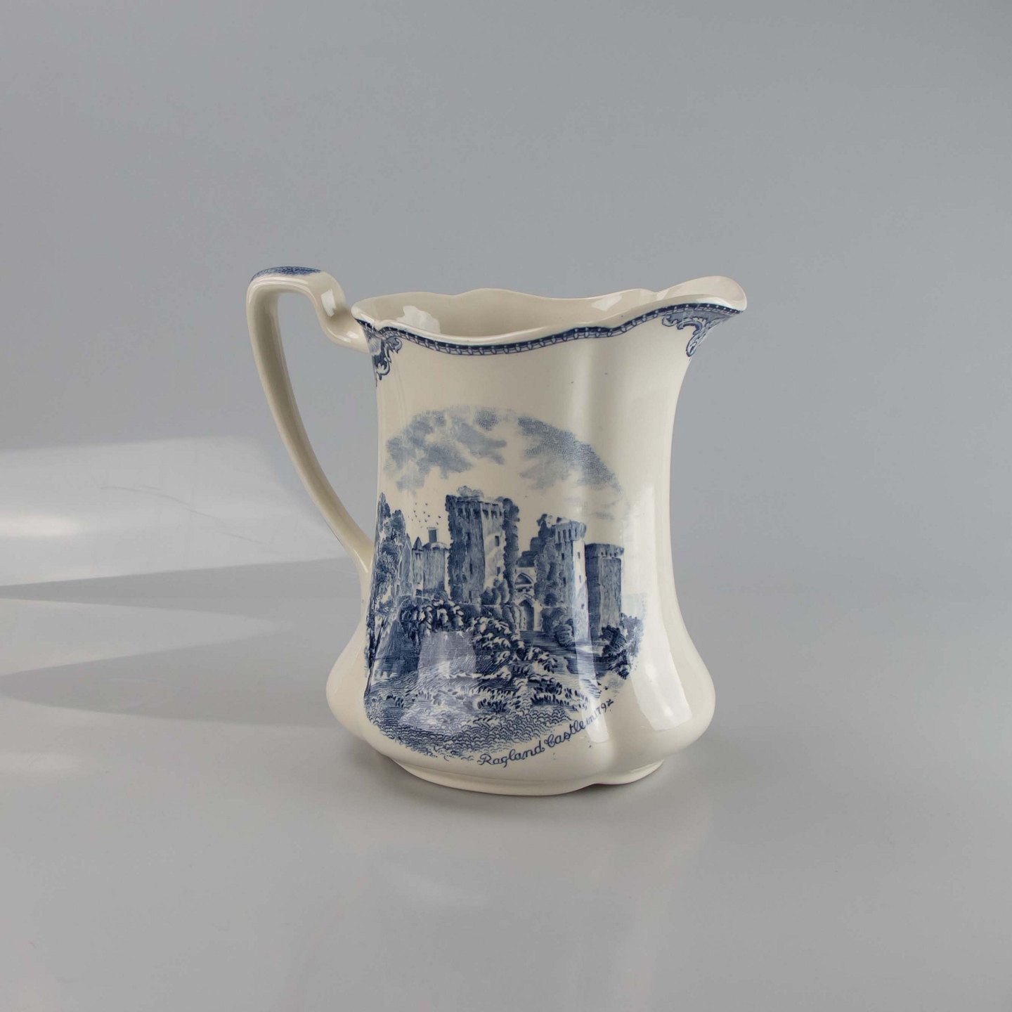 Mælkekande i lys fajance med blådekoreret slotsmotiv.