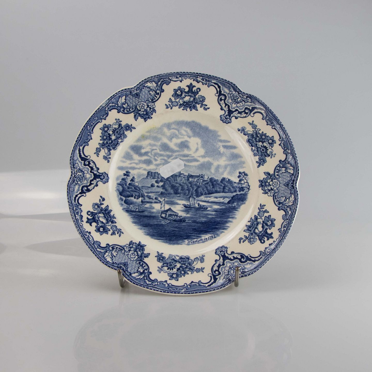 Tallerken i lys ironestone med blådekoreret slotsmotiv.