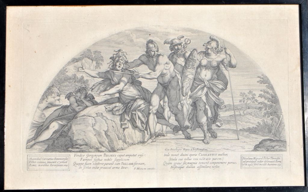 Mignard Dàvignon, Nicolas (1606 - 1668) Italien: Perseus dræber Medusa. 24,5 x 43.5 cm. Signeret 1637.