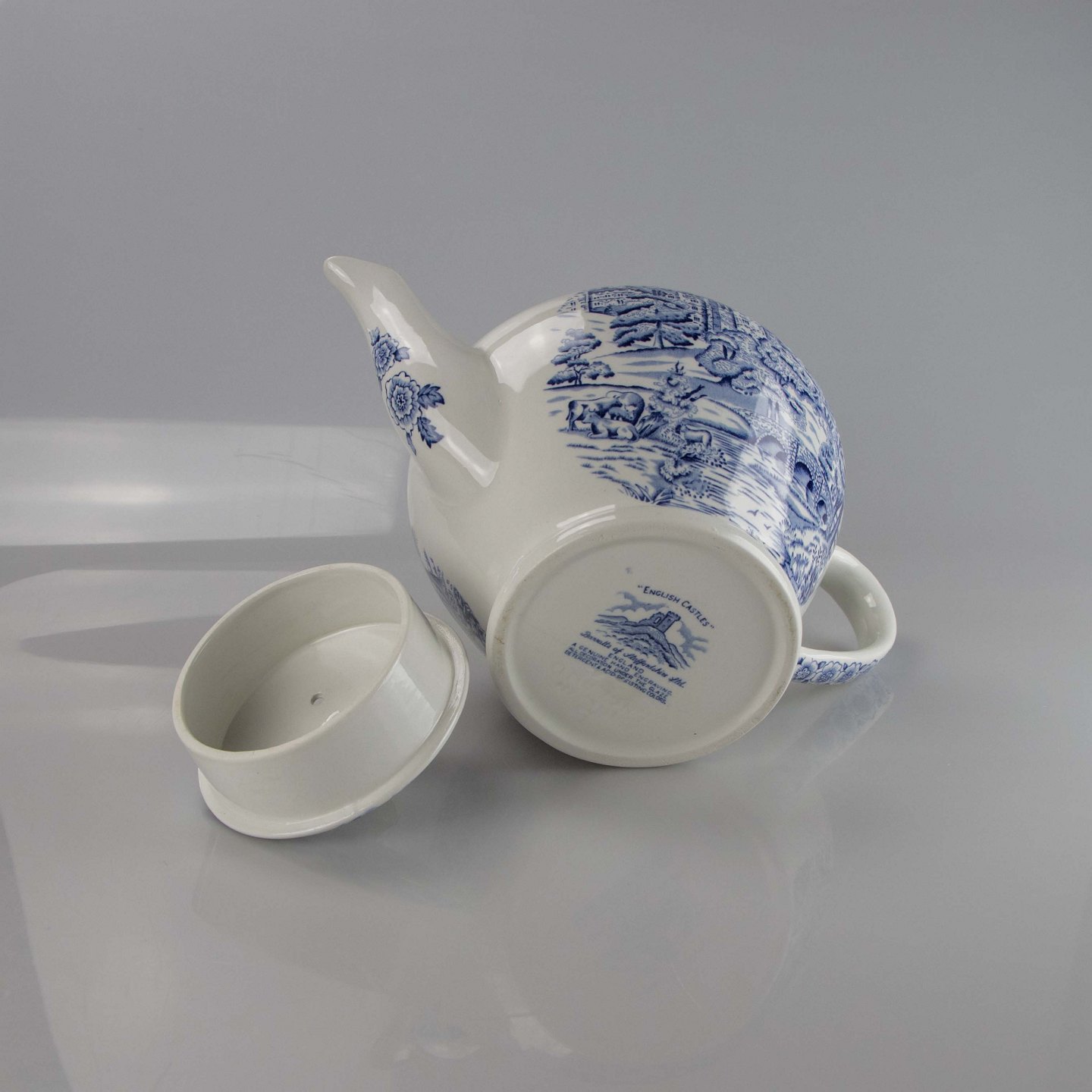 Tepotte i lys fajance med blådekoreret slotsmotiv.