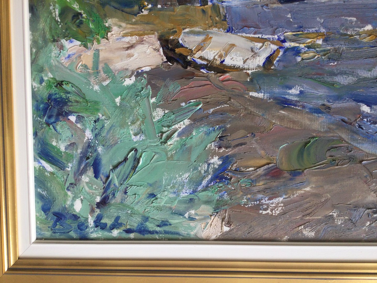 Maleri af Børge Bokkenheuser - Kystparti med båd på strand.