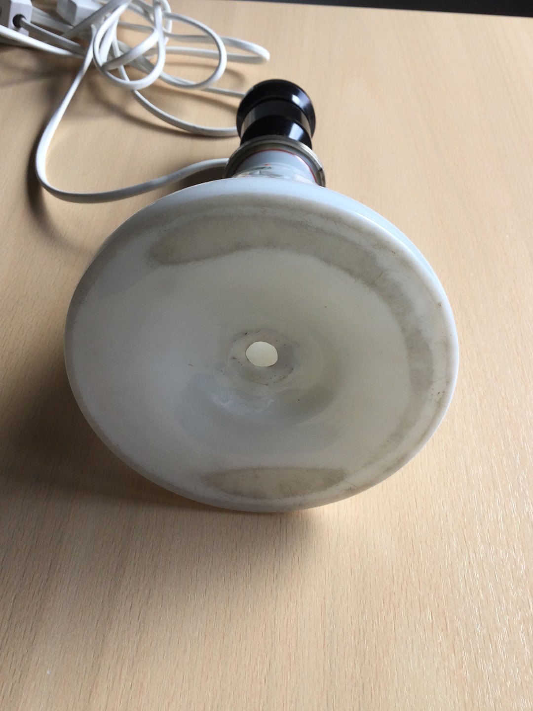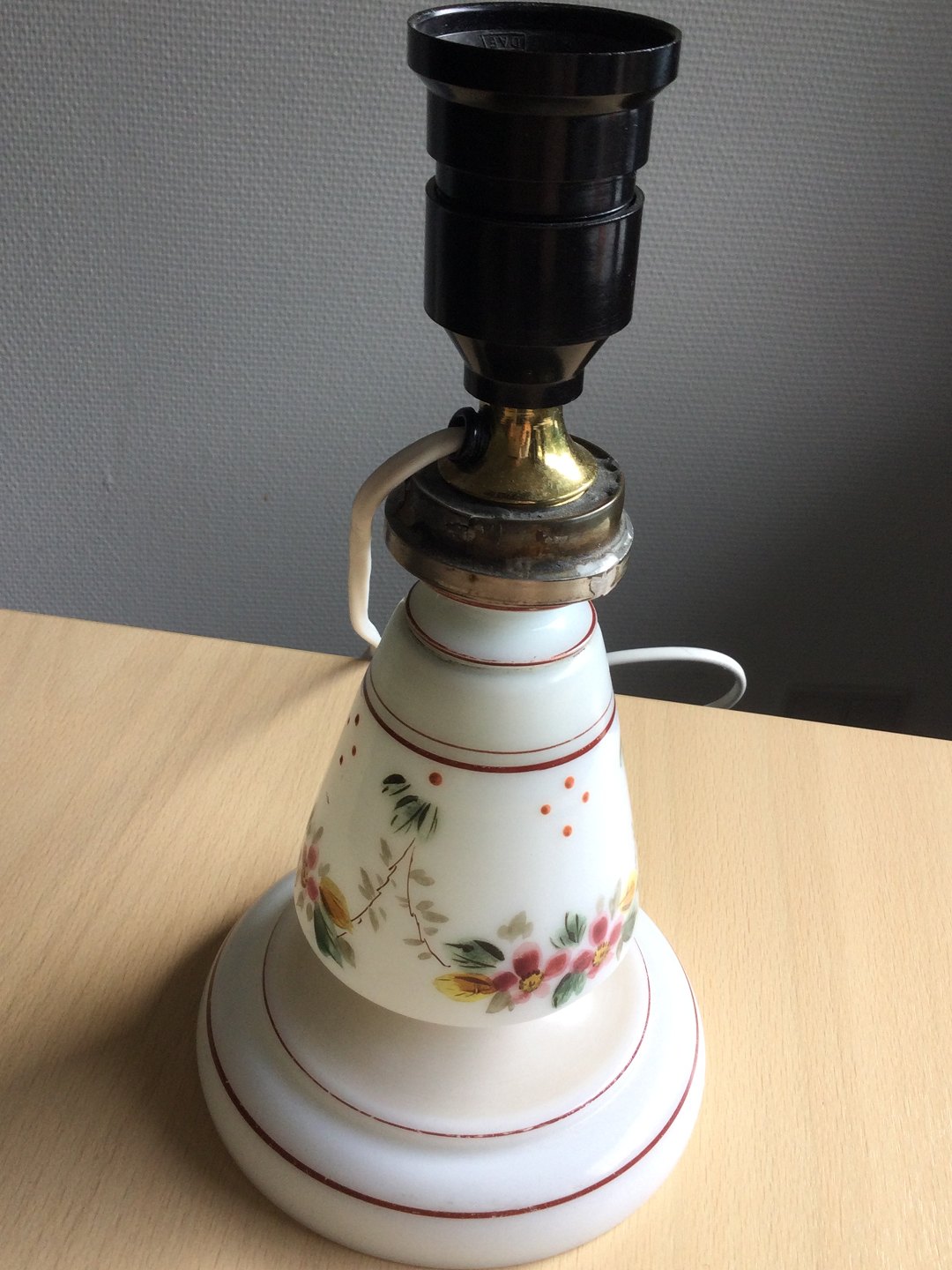 Gammel petroleumslampe af hvid opaline omlavet til el.