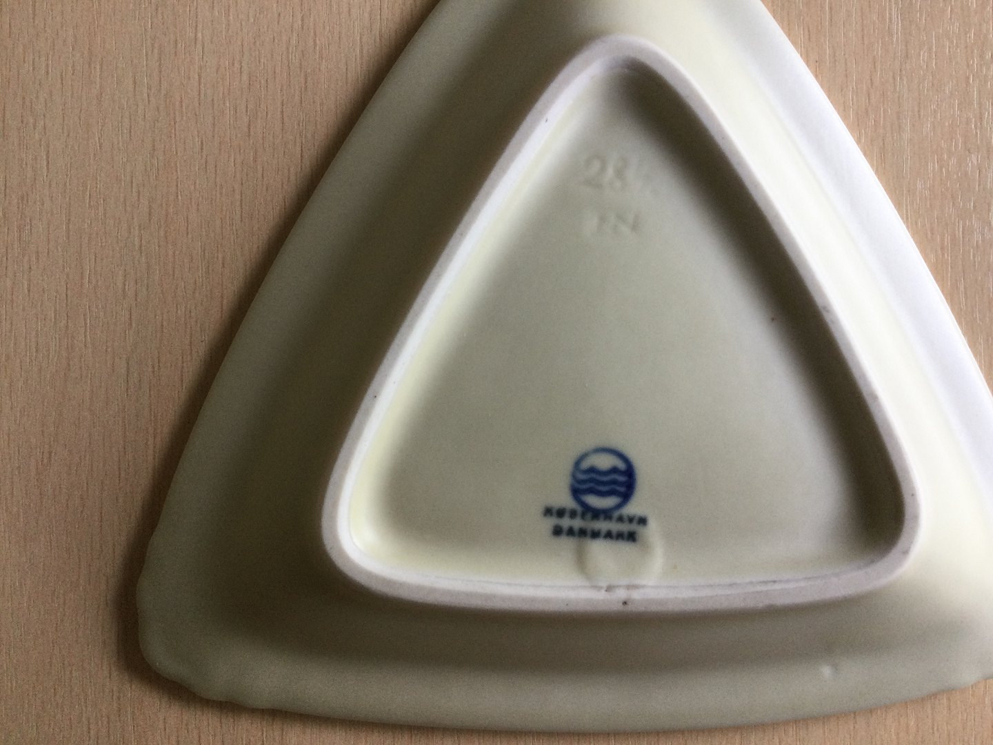 Trekantet korpus med creme glasur og blå tekst.