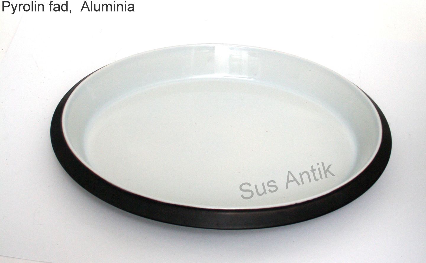 Text available in Danish: Stort fad, Pyrolin, Aluminia