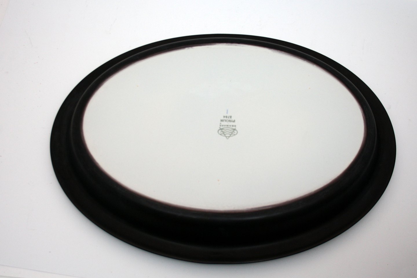 Text available in Danish: Aluminia, Pyrolin, Stort ovalt fad med matsort glasur udvendig og gråhvid glasur indvendig. Ildfast ovnserie designet af Ingvar Olsen i 1959. Nr. 2784. Længde 38 cm. Bredde 28,5 cm. Højde 4,5 cm. Fin stand. Pris: 425 kr.