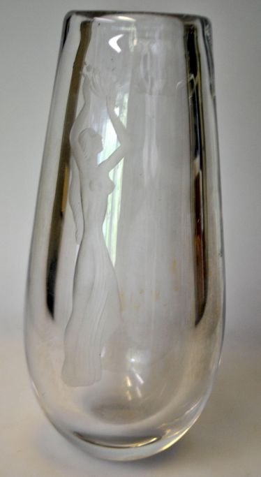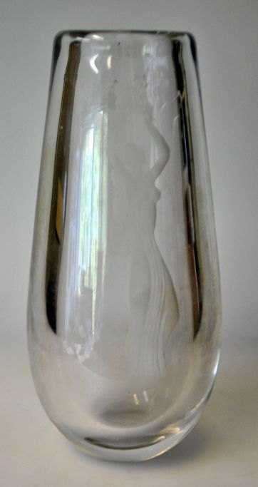 Orrefors art glass vase, 2623, design Sven Palmqvist (1906 - 1984). Sweden. Grindet glass with motif of woman with flowers. Signed: Orrefors Palqvist 2623, TLK 1. H .: 22.5 cm.