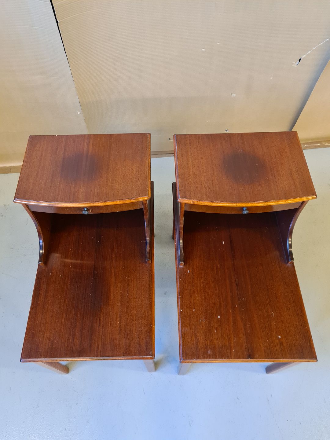 2 natborde med skuffe i fineret mahogni fra 1980erne. de har brugsspor.