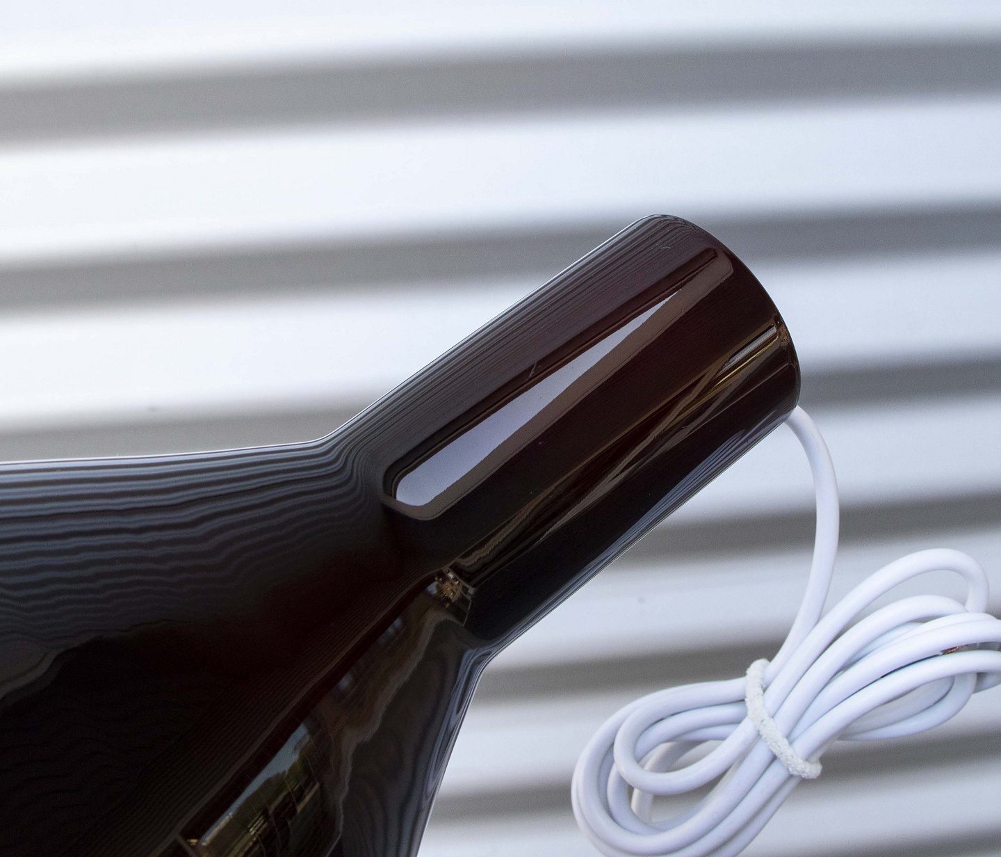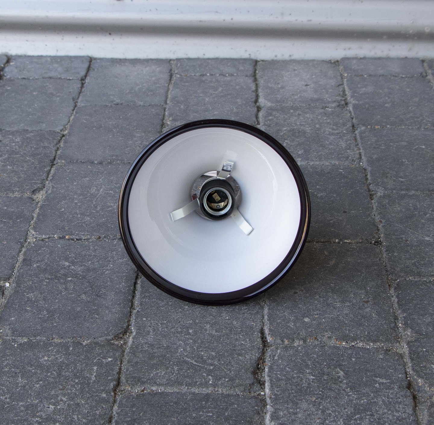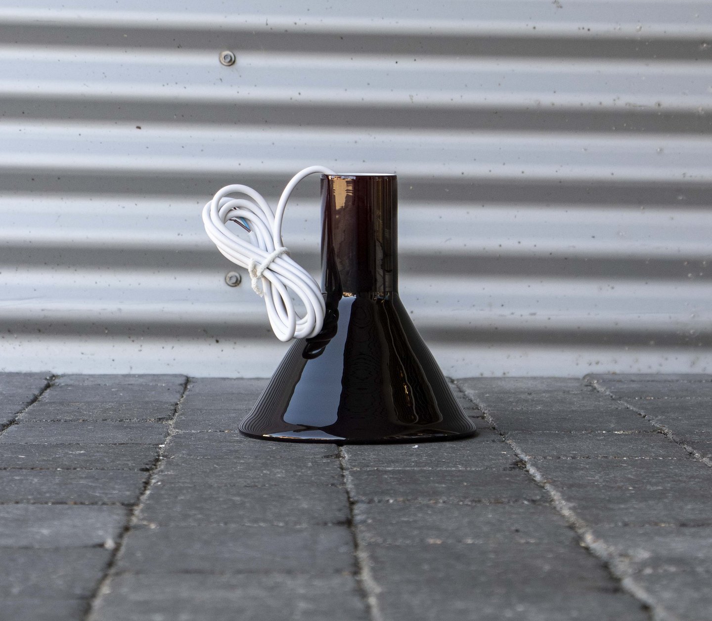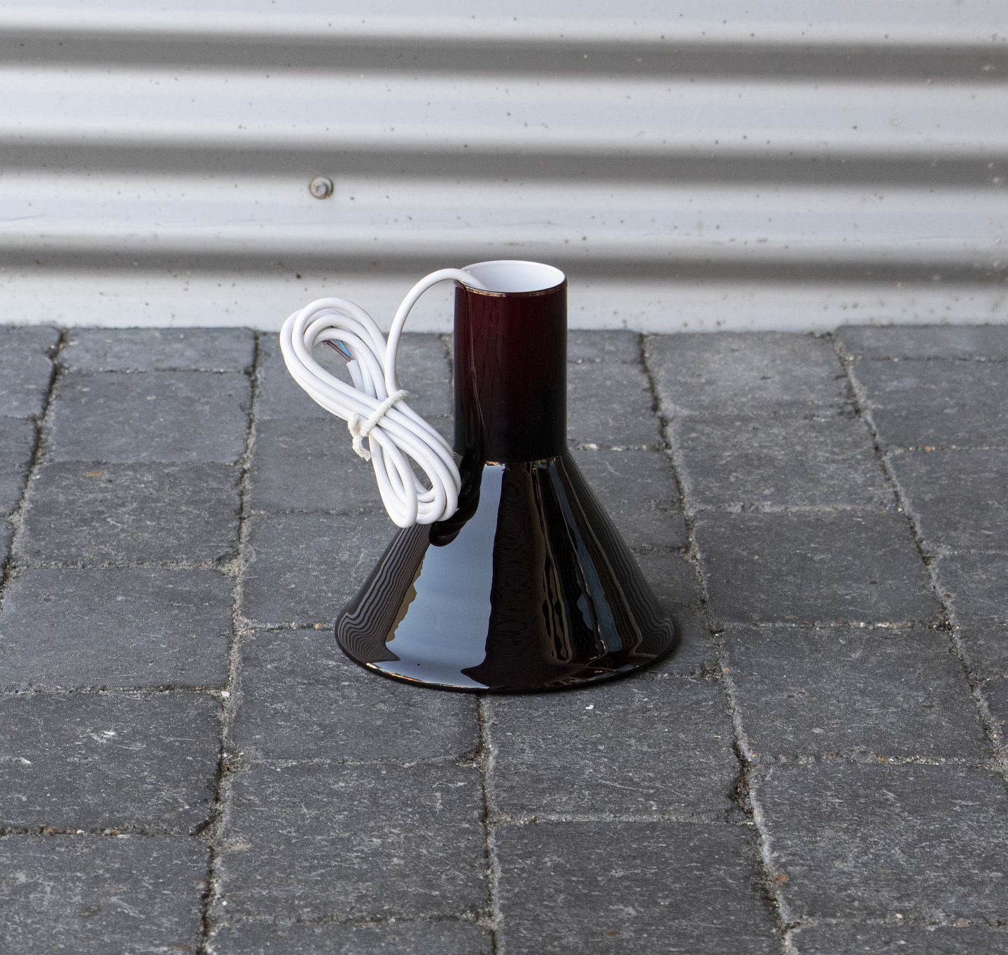 Loftslampe med skærm i aubergine/sort glas med opalhvid inderside, med lys igennem fremtræder den rødlig