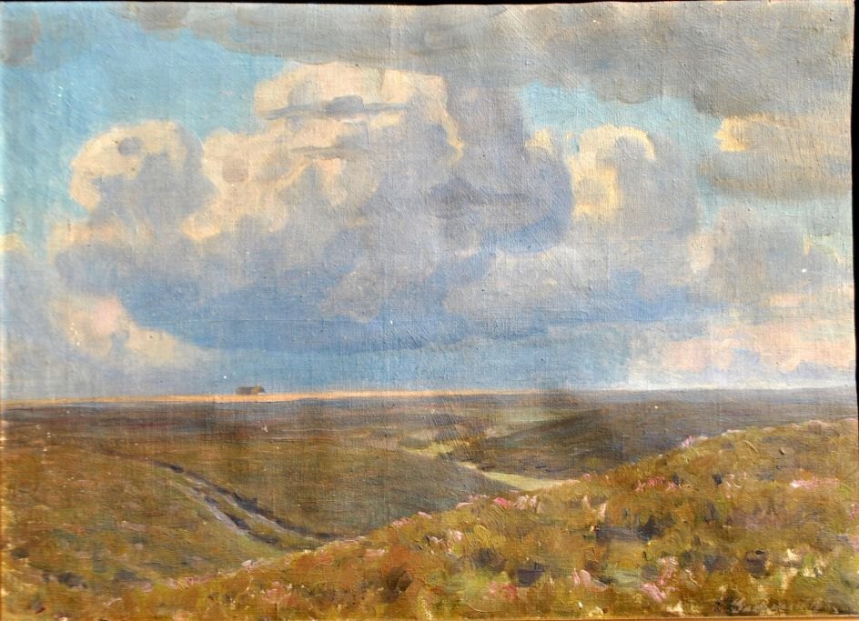 Gammeltoft, L. (19/20. årh.): Tordenvejr over Karup Hede. Olie på lærred. Signeret. 39 x 55 cm.