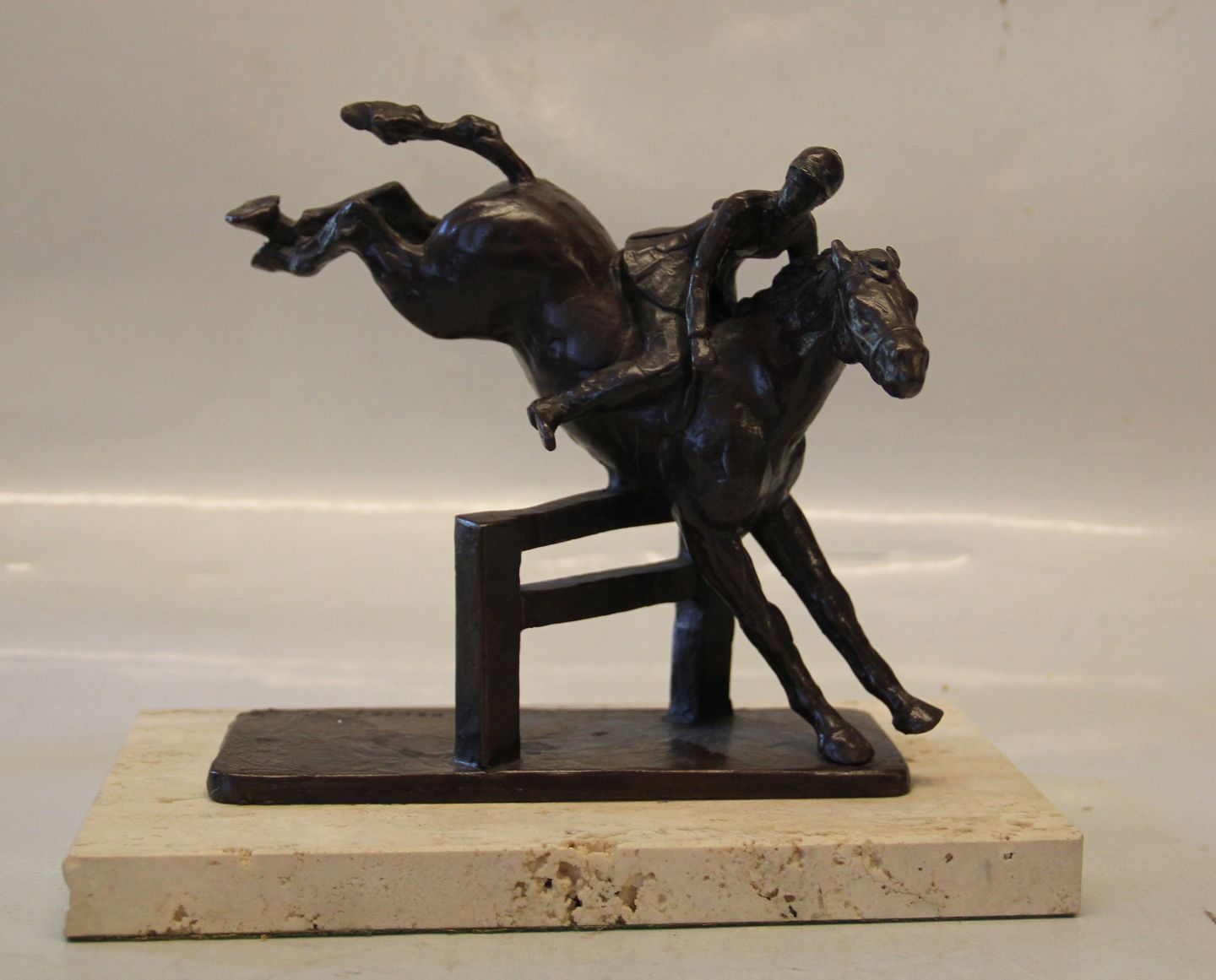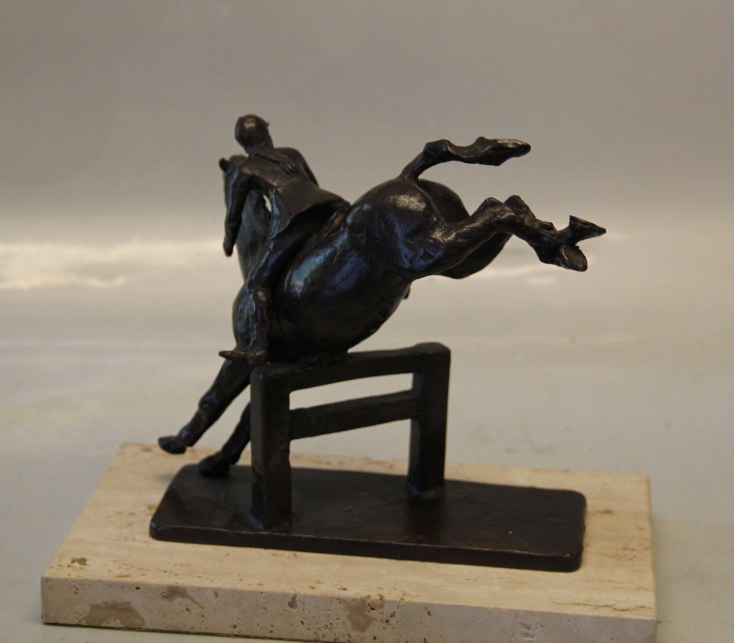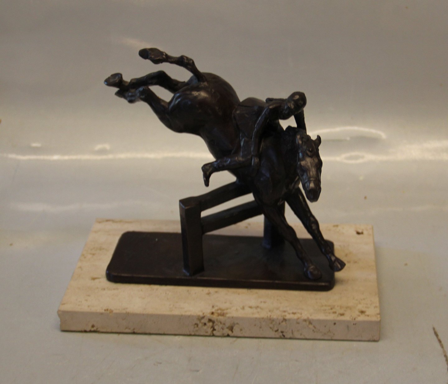 Rider and horse in bronze on marble base 12.5 x 22 cm H: 19 cm Small chip on the marbel base equestrian jumping