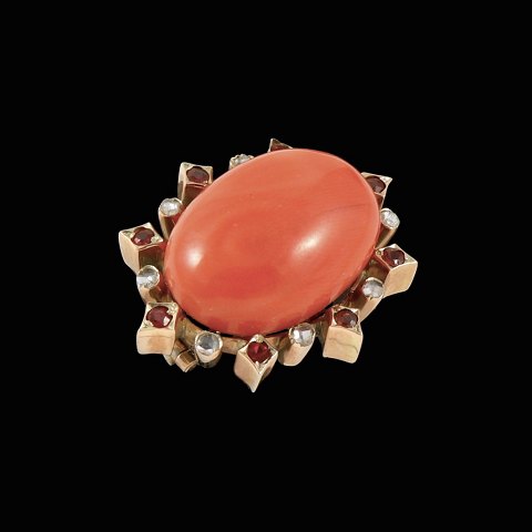 Broche i 14k guld med koral, rubiner og diamanter. |