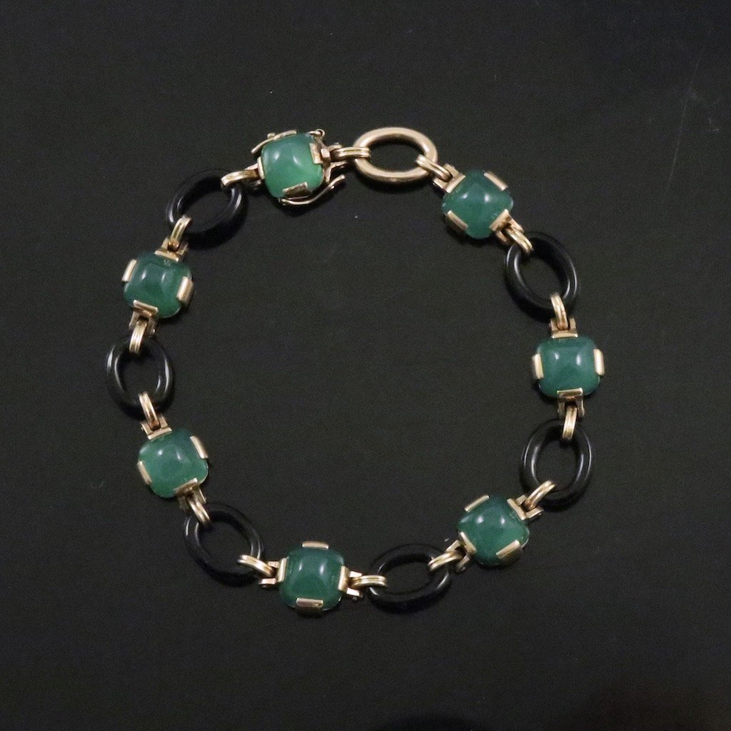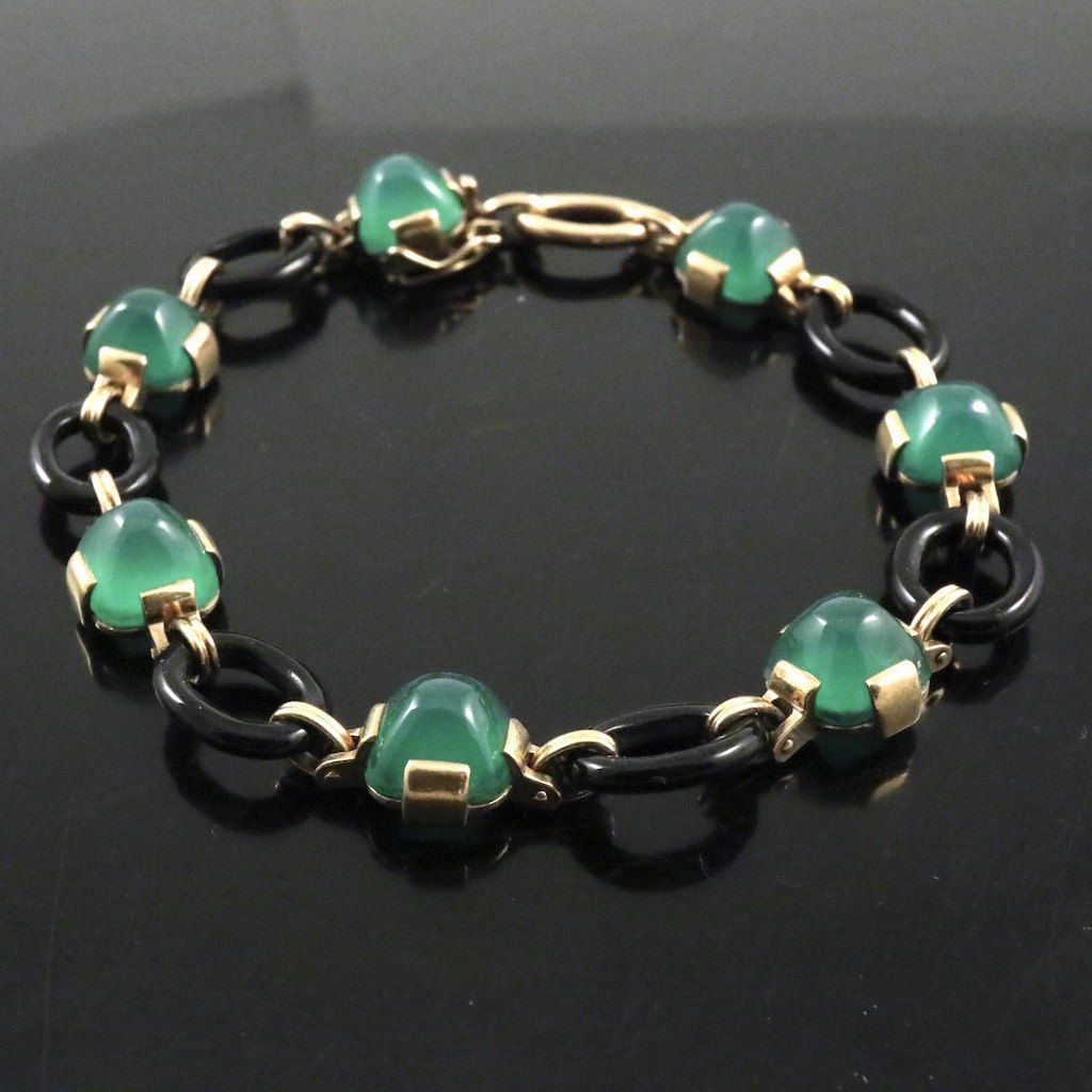 Armbånd i 14k guld med grøn og sort agat.